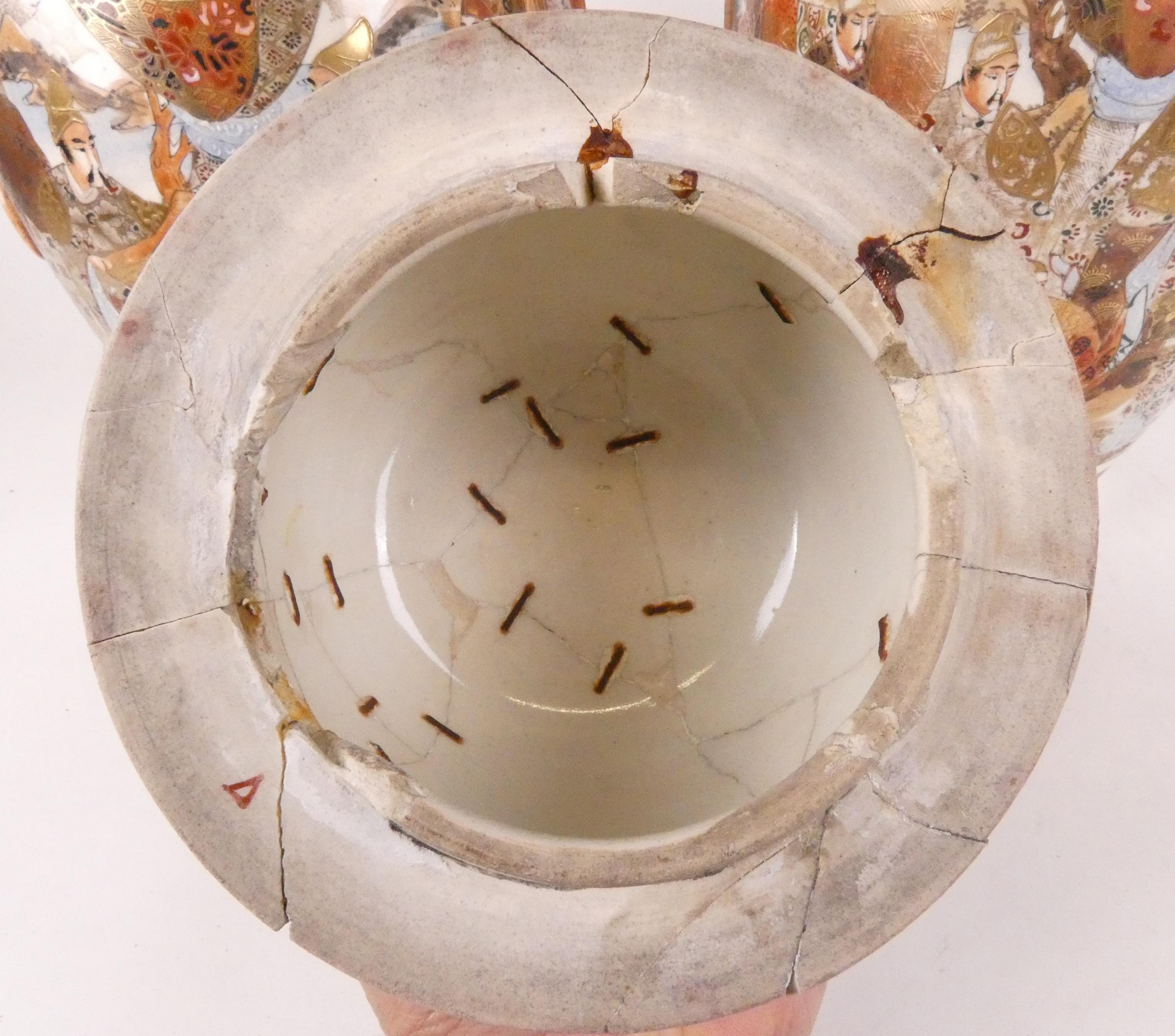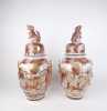 Asiatique: Paire de potiches couvertes (1 couvercle avec ancienne rest.) en faïence Satsuma Japon décor peint de scène de genre fretel -chien de Fô- H:56cm