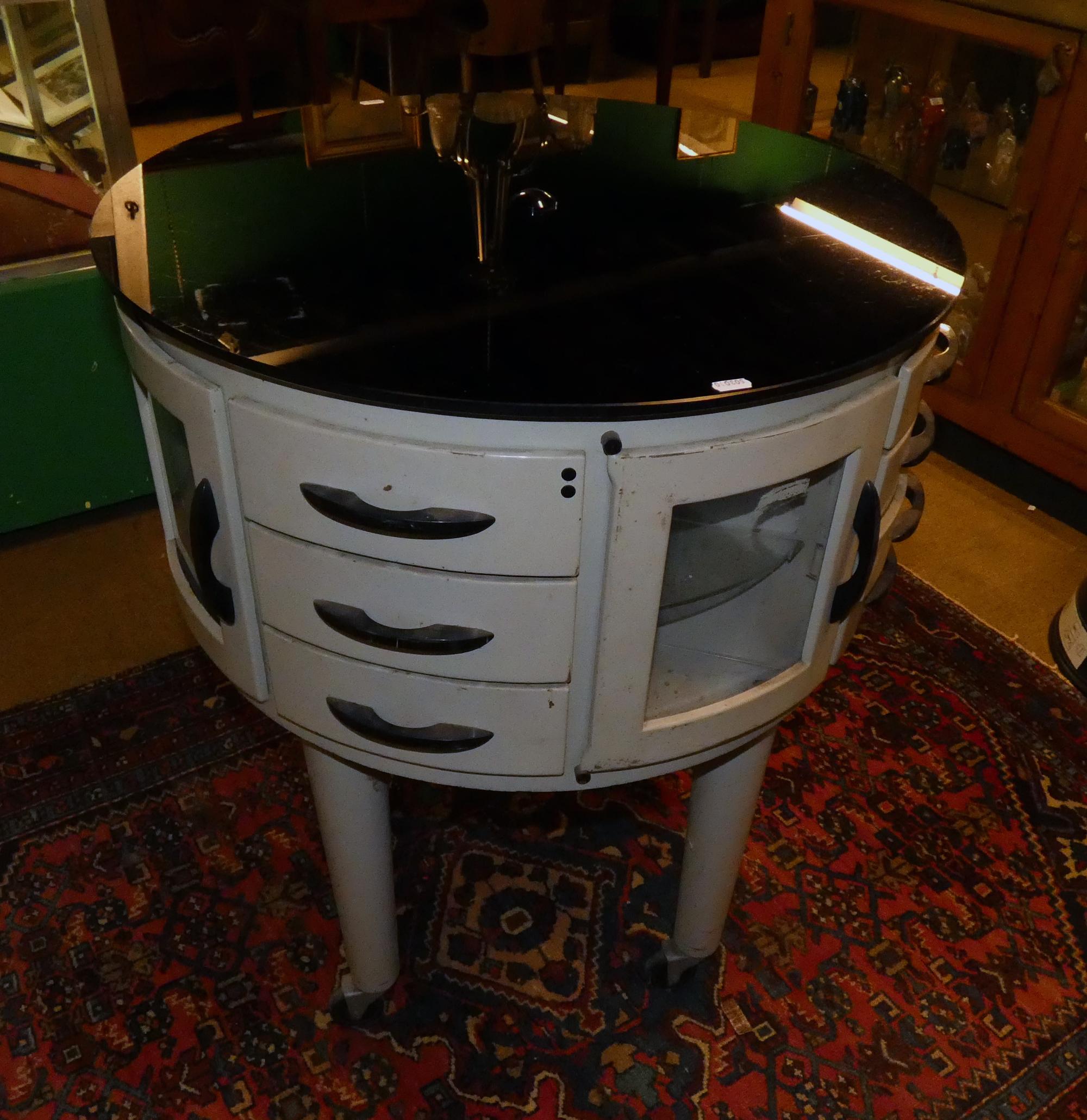 Meuble de dentiste modèle GIRATOR LEON MARTIN en métal laqué et verre (bel état gen, usure d'usage) 4 portes 14 tiroirs, 4 pieds sur roulettes H:89cm Diam:71cm