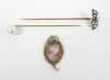 Bijou: 2 Epingles de cravate en or jaune 14K sertie de perles et d'éclats de diamants (1mq) + pendentif camée entourage en or jaune 14K Ptotal brut: 4,4g (3pcs)