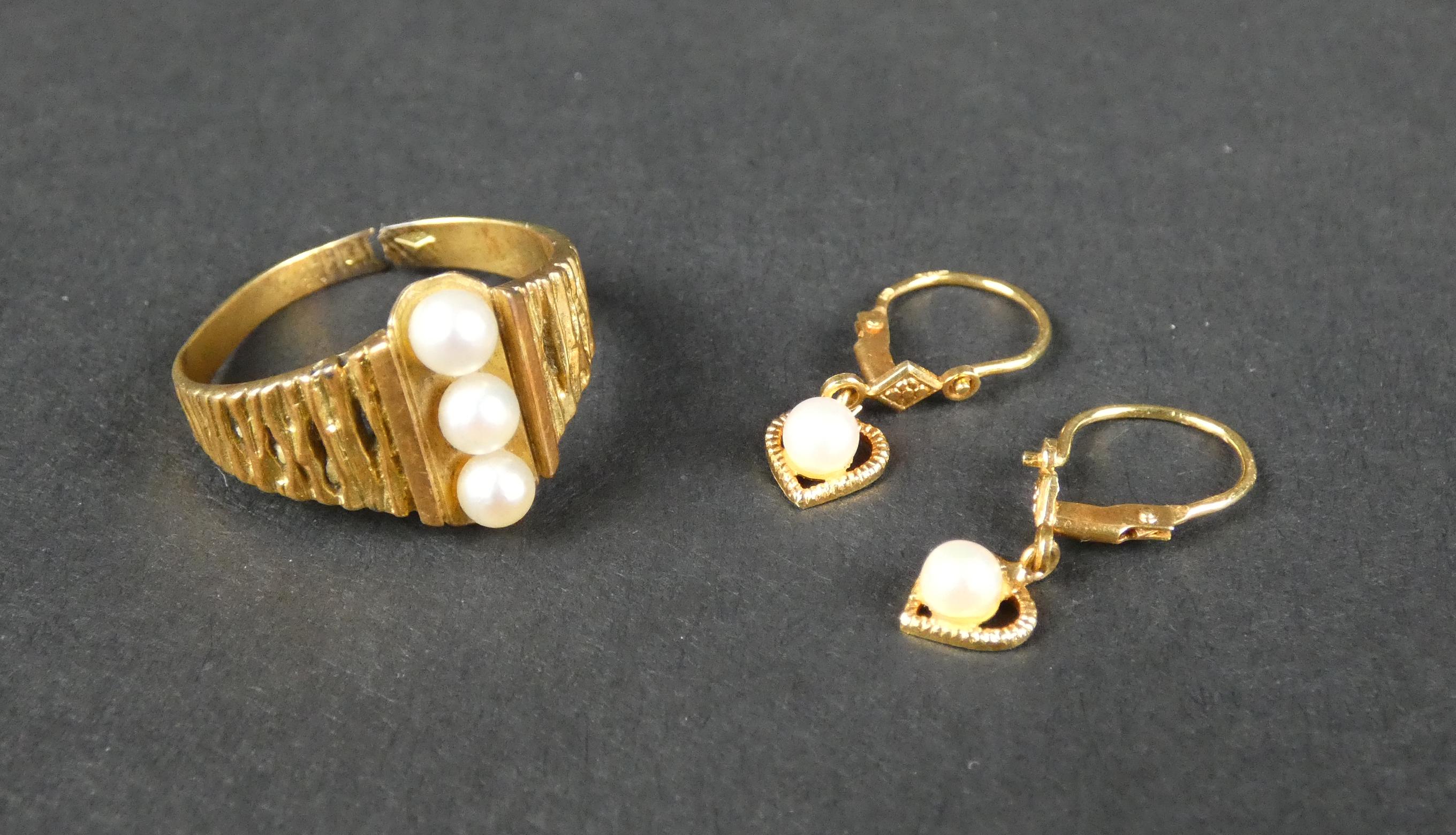 Bijou: Bague (acc) sertie de 3 perles de culture et paire de boucles d'oreilles serties de perles de culture le tout en or jaune 18K P: 4,7g