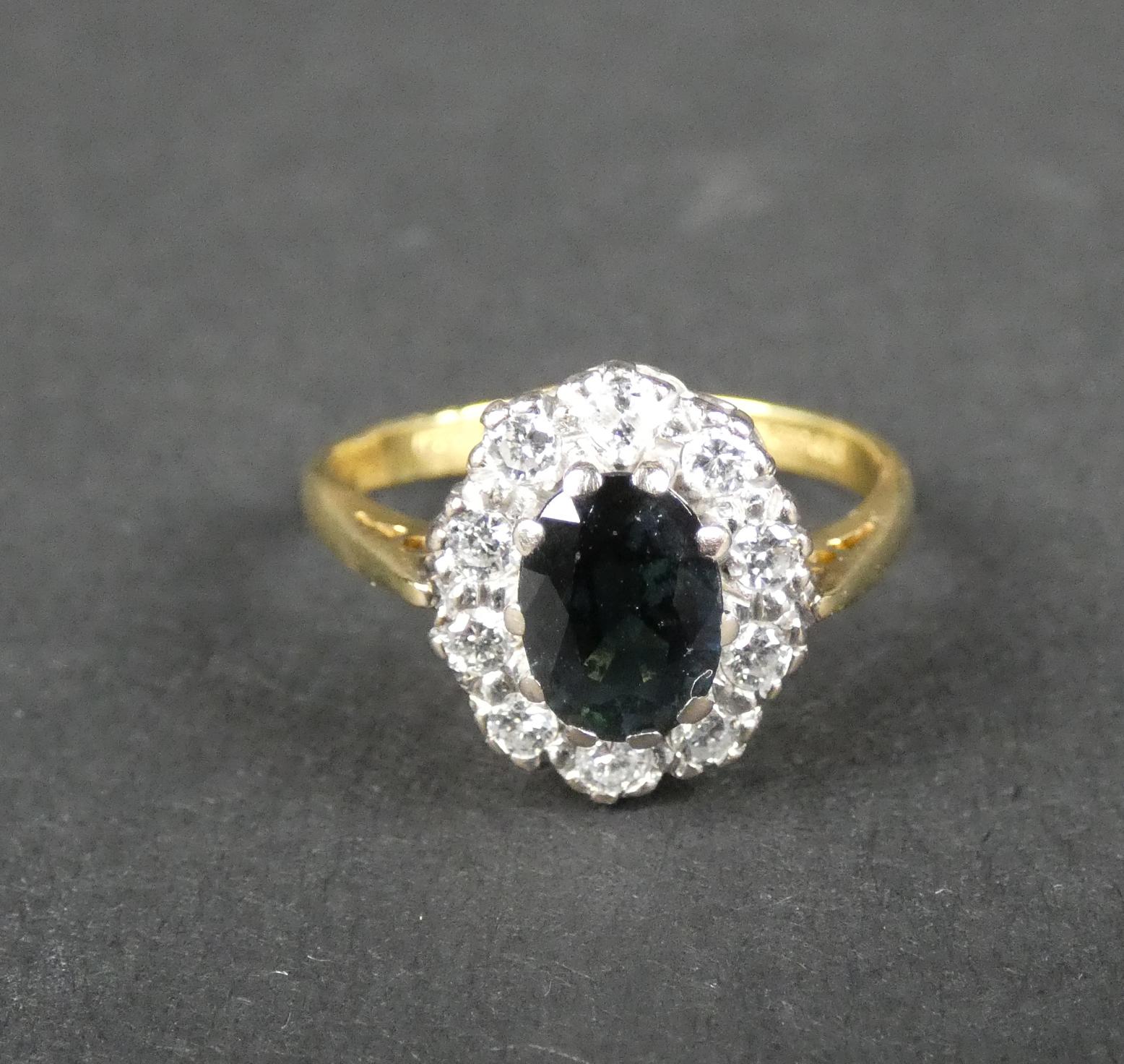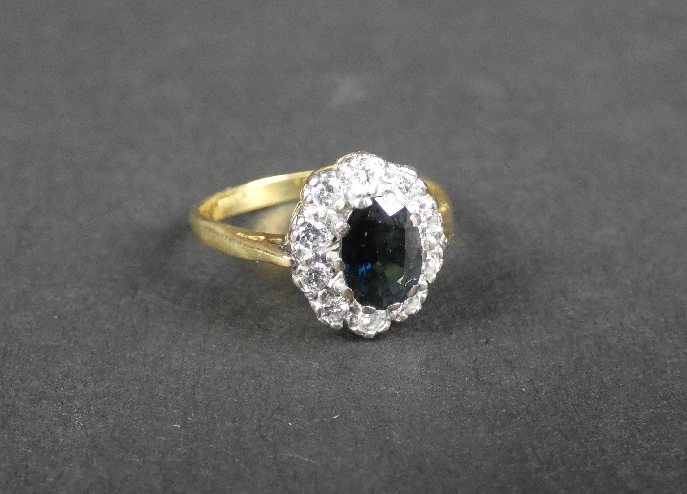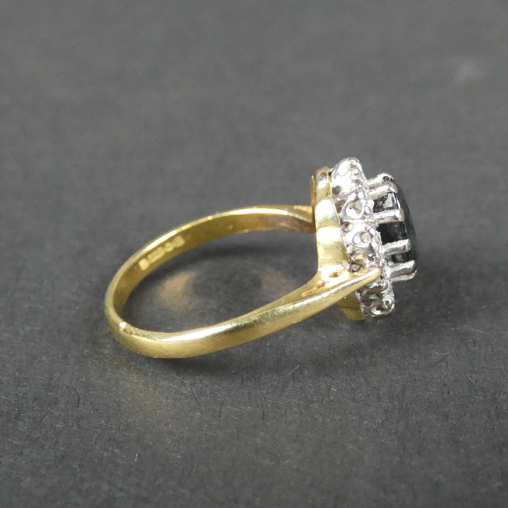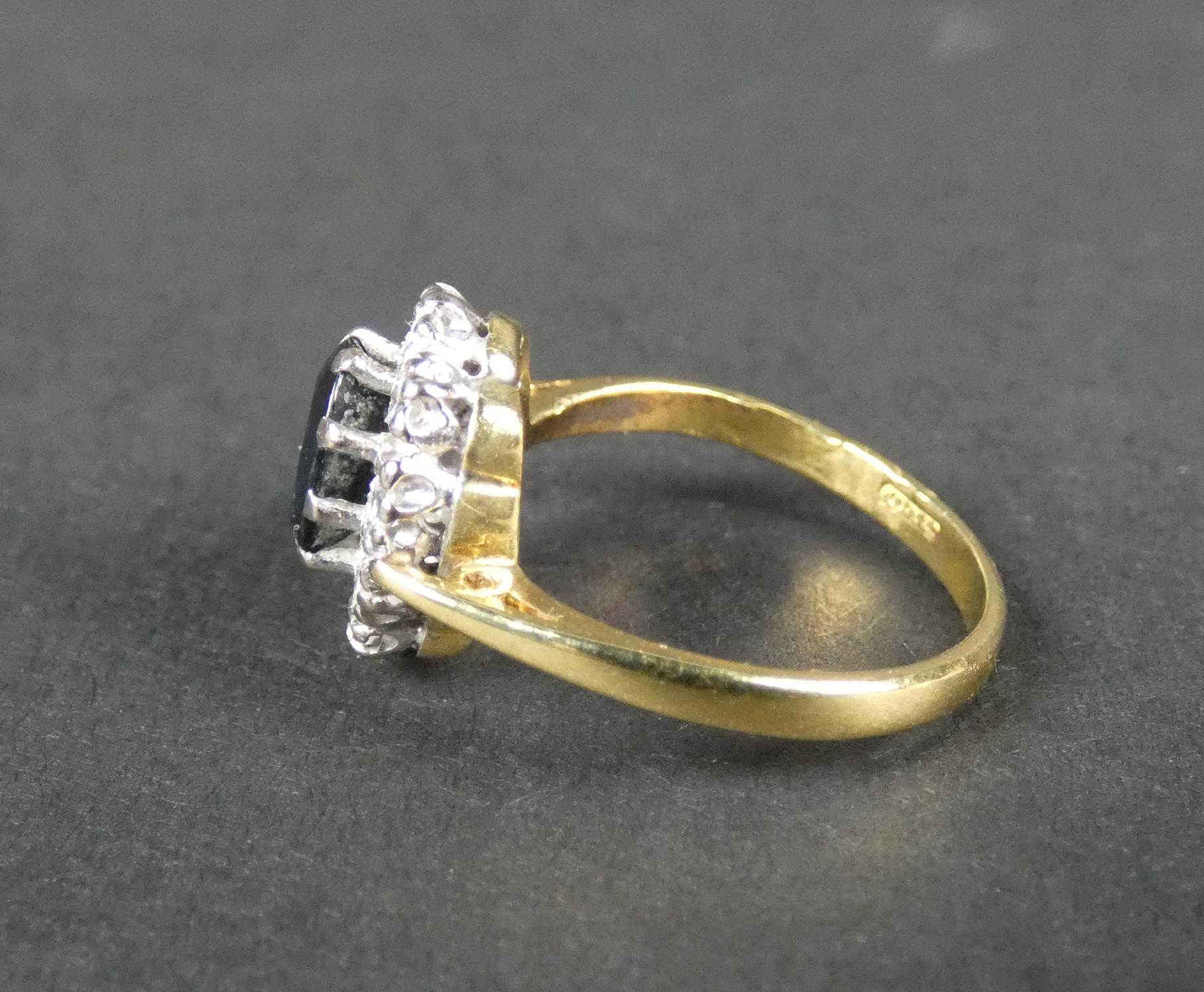 Bijou: Bague en or jaune et blanc 18K sertie d'un saphir ovale d'env. 0,60cts entouré de 10 diamants d'env. 0,02cts P: 2,9g TDD: 48