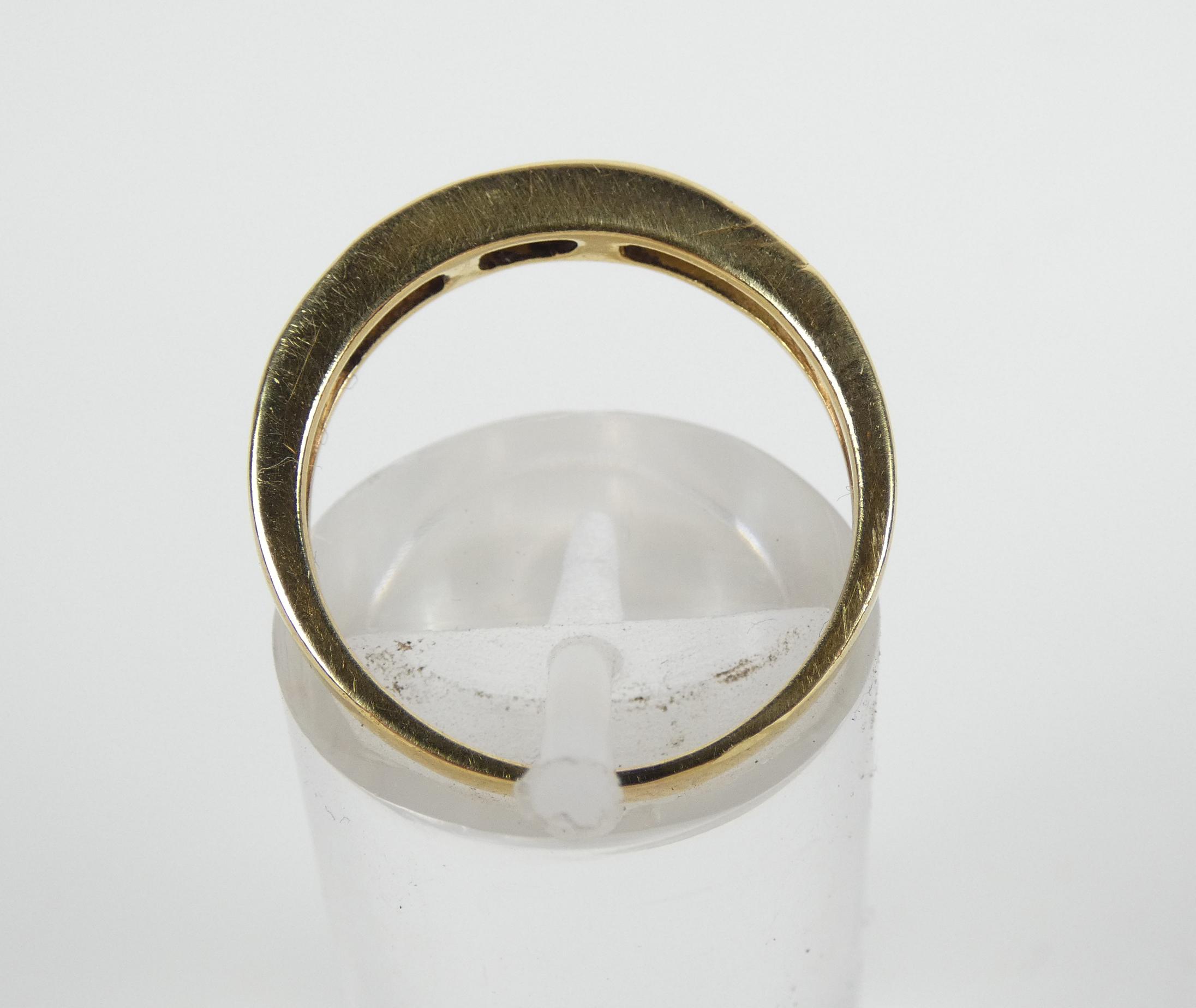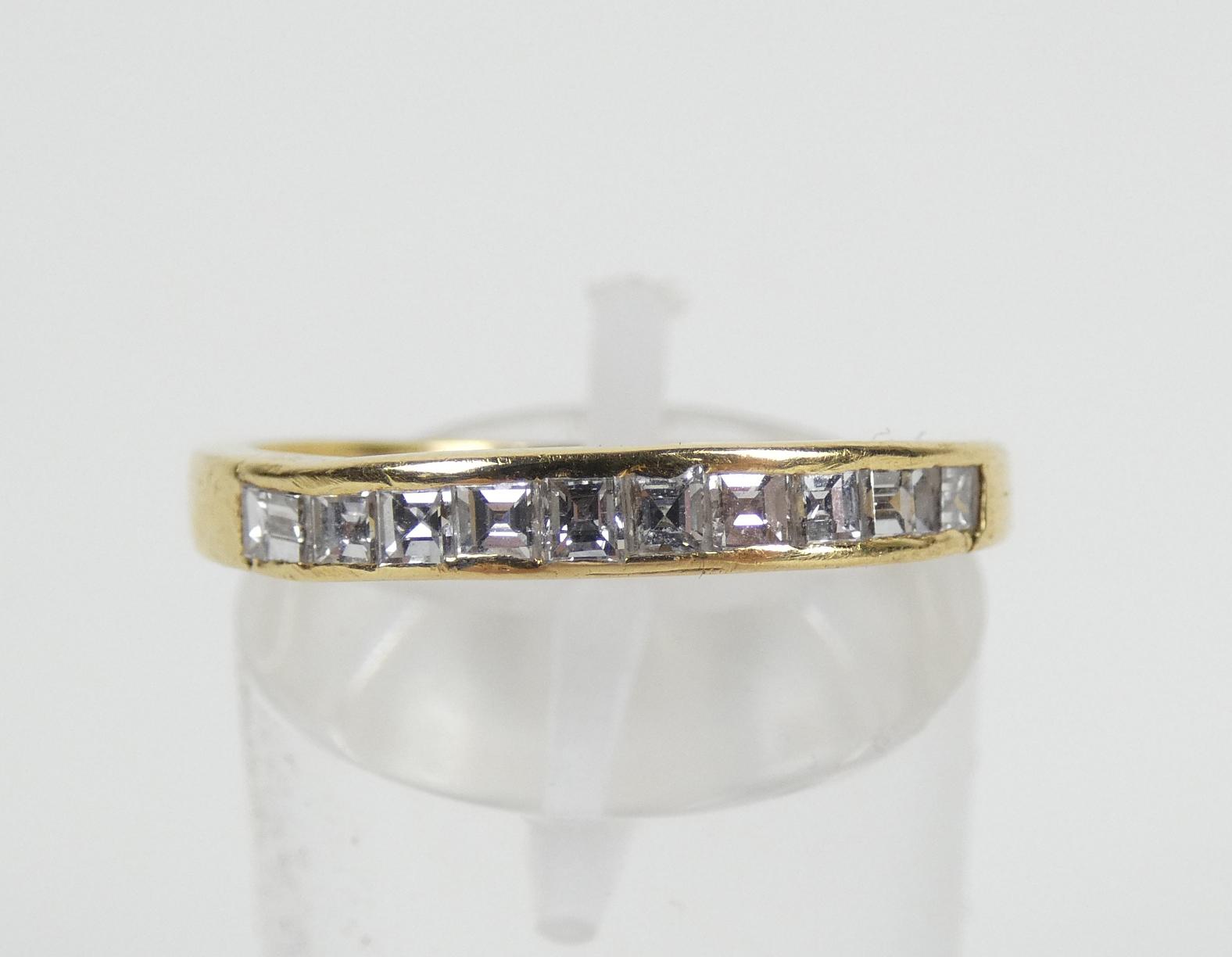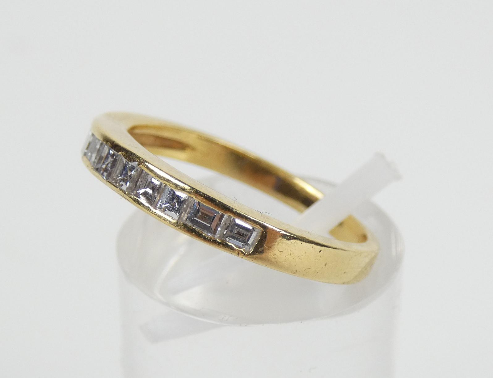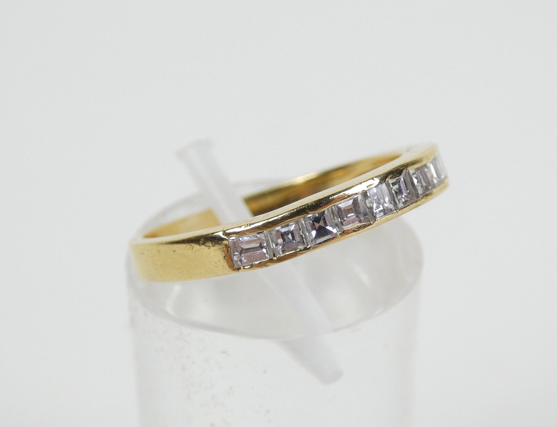 Bijou: Bague demi alliance américaine en or jaune 18K sertie de 10 diamants taille princesse et émeraude P: 3,1g TDD: 55