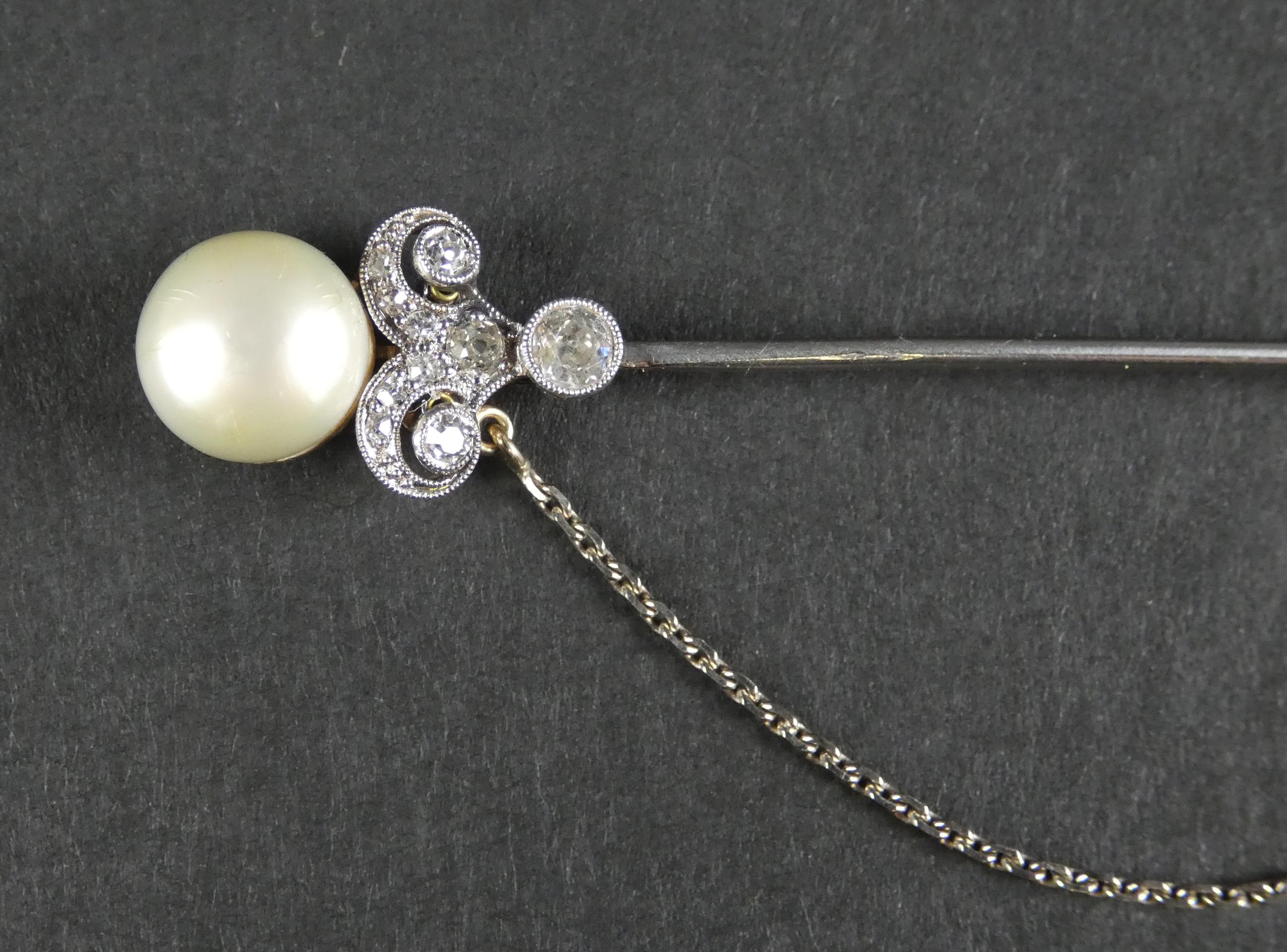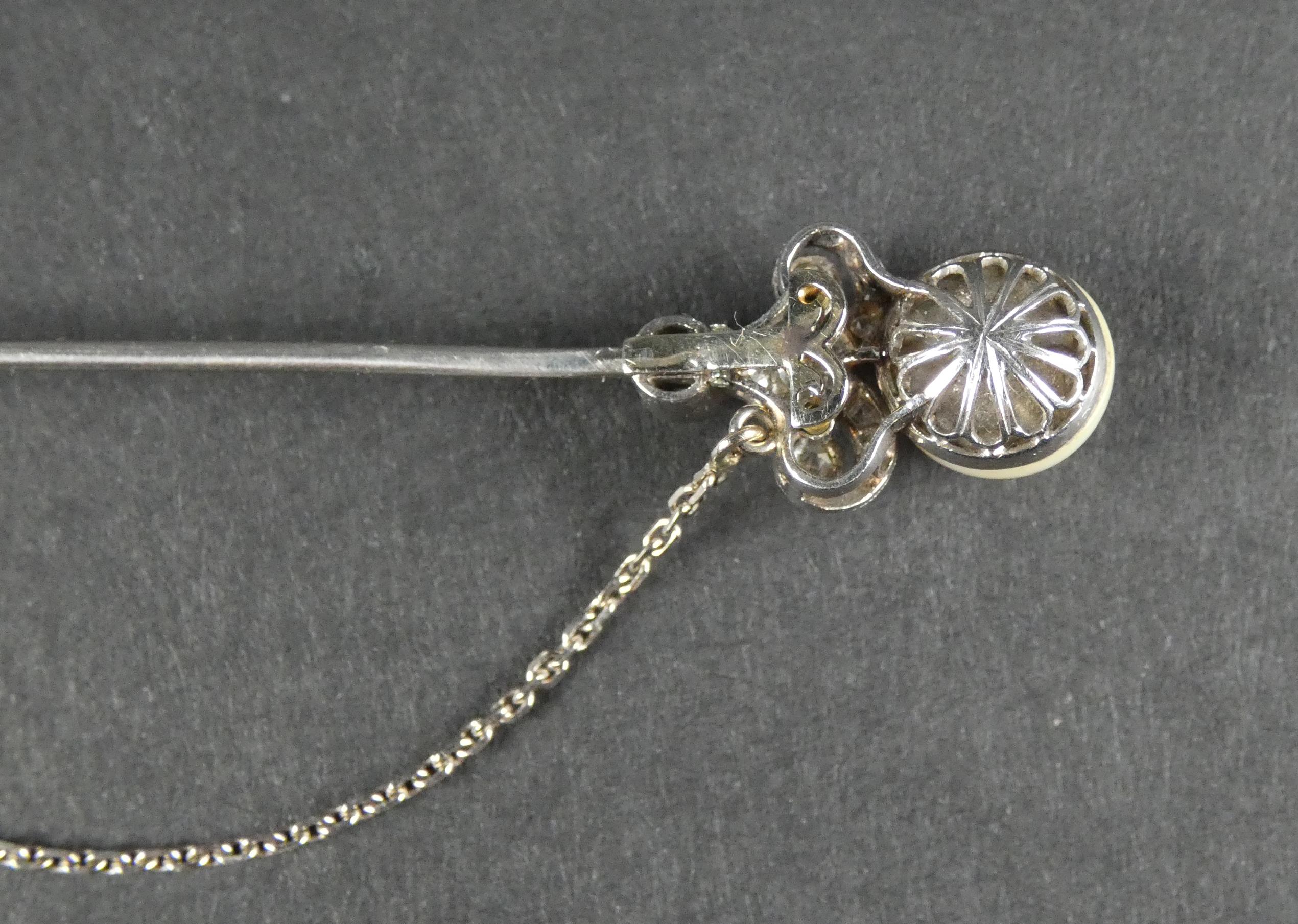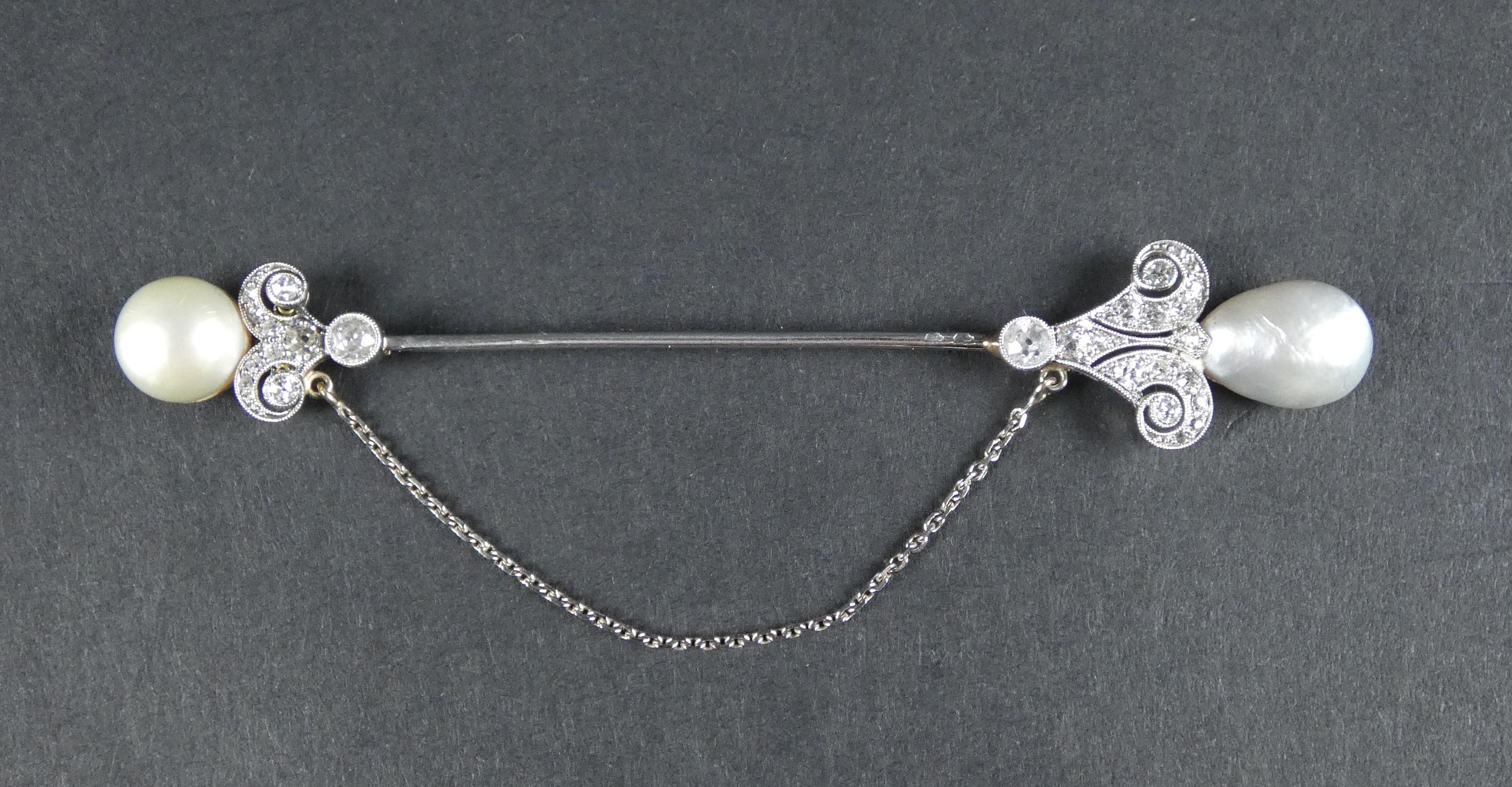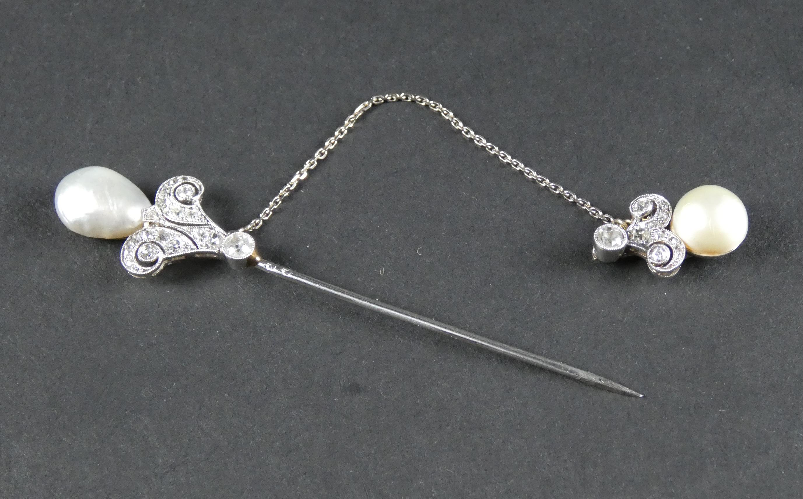 Bijou: Epingle à jabot en platine sertie de diamants taille ancienne et de 2 perles avec chaine de sécurité P: 6,2g L: 8,5cm