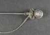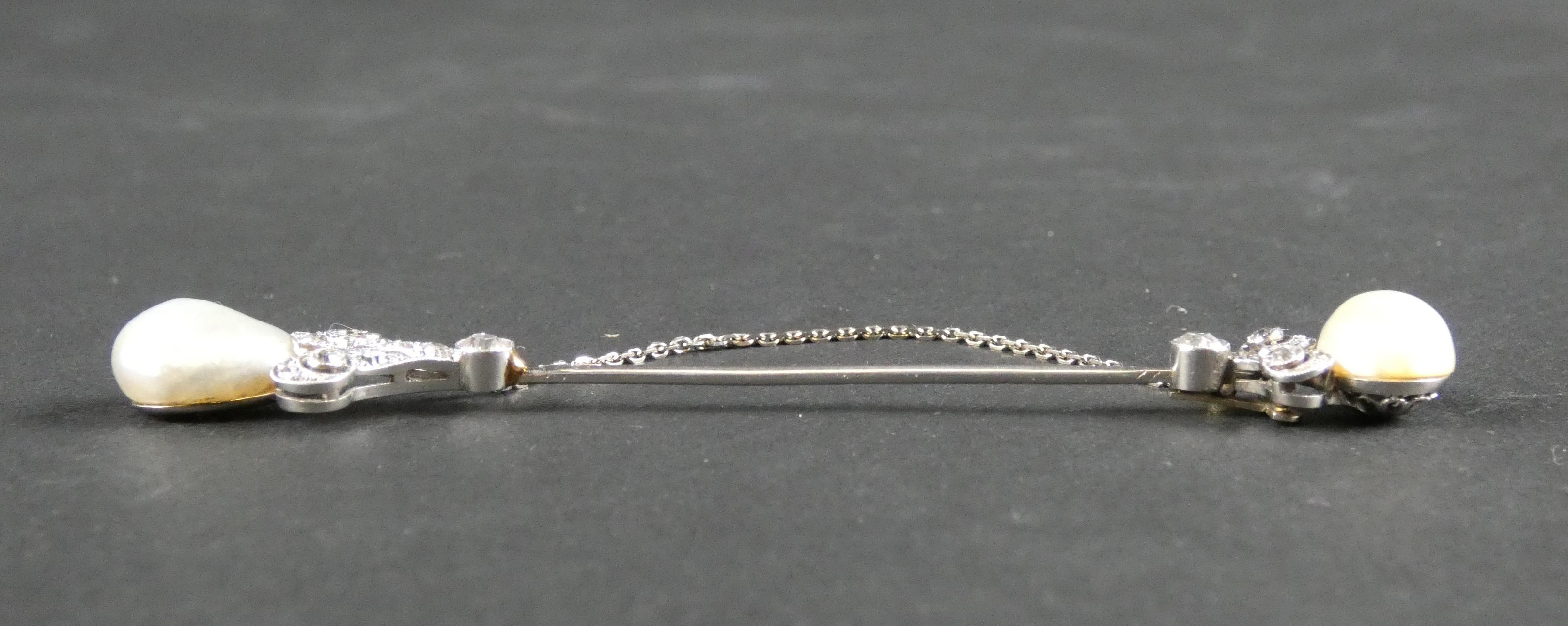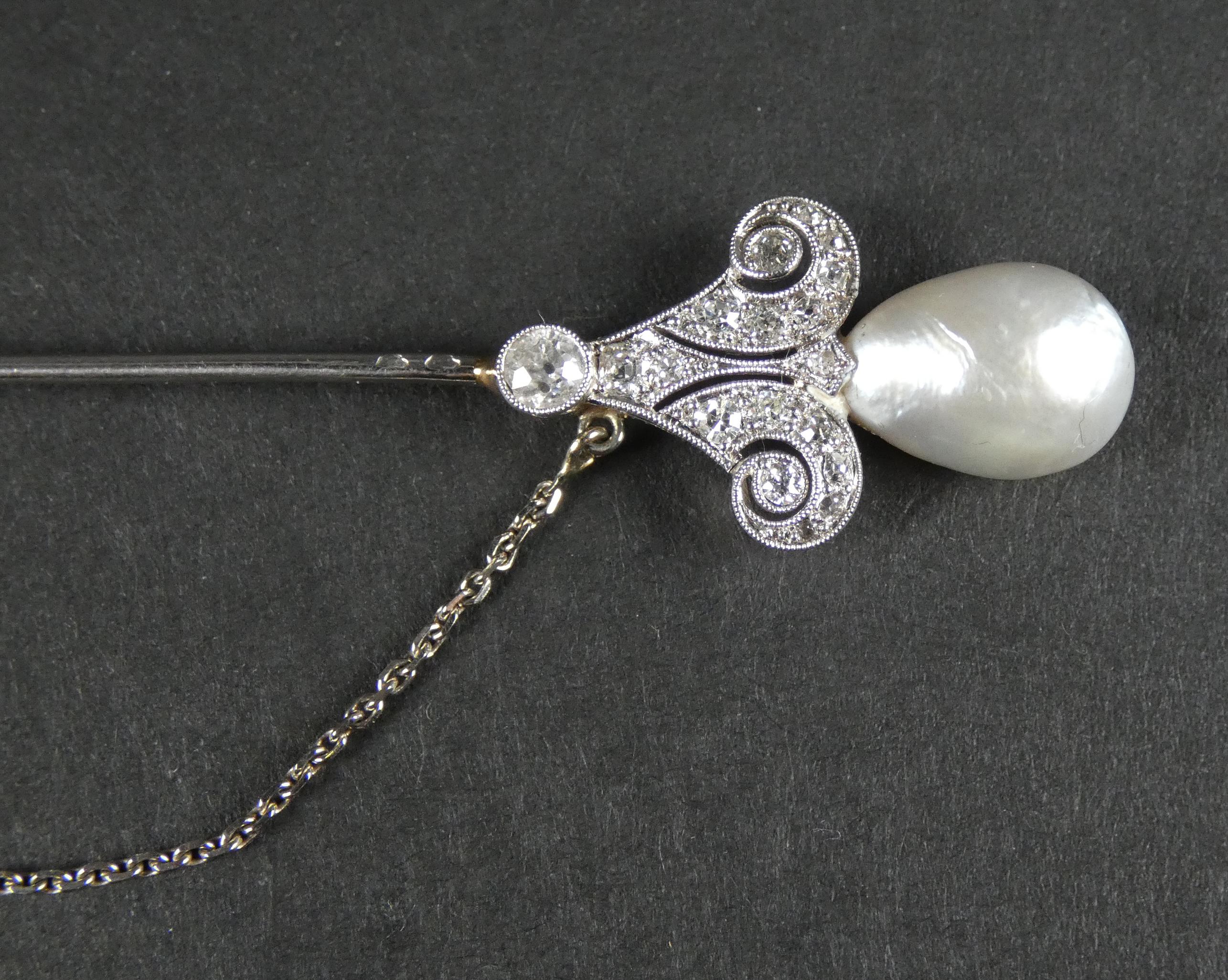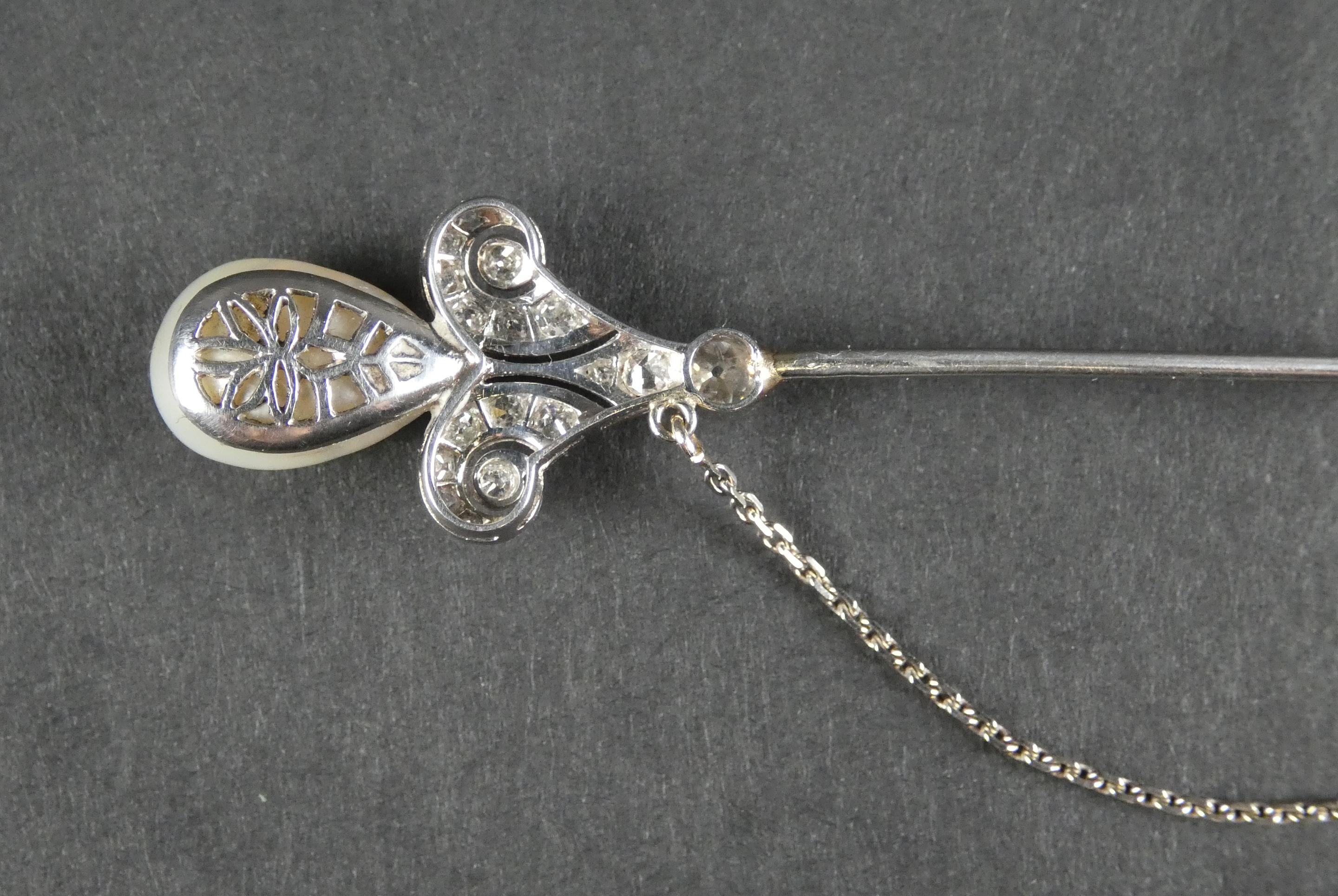 Bijou: Epingle à jabot en platine sertie de diamants taille ancienne et de 2 perles avec chaine de sécurité P: 6,2g L: 8,5cm