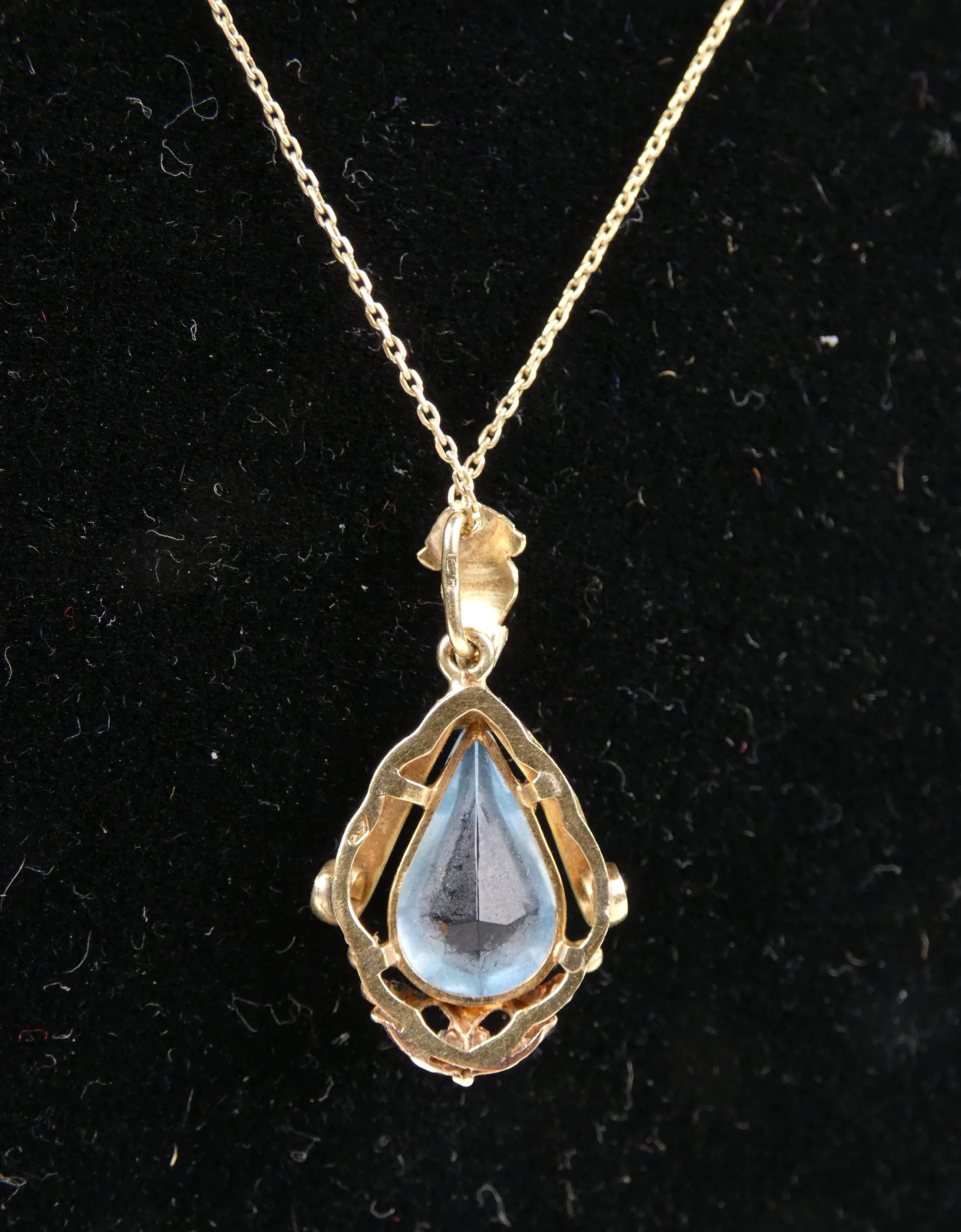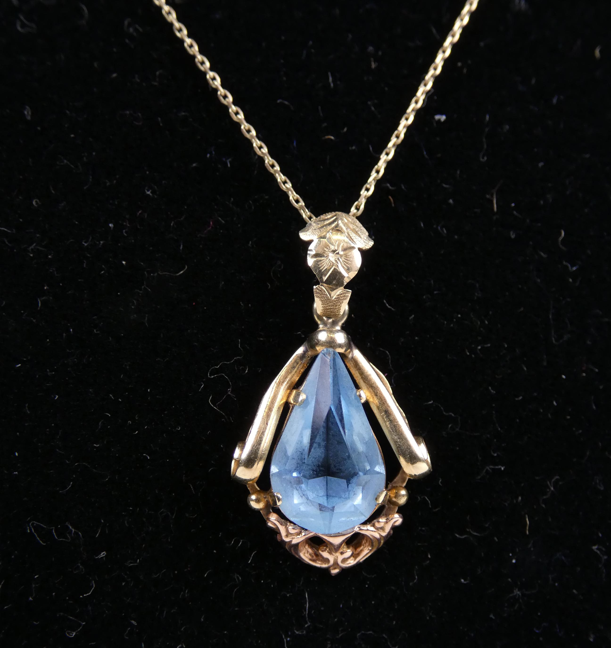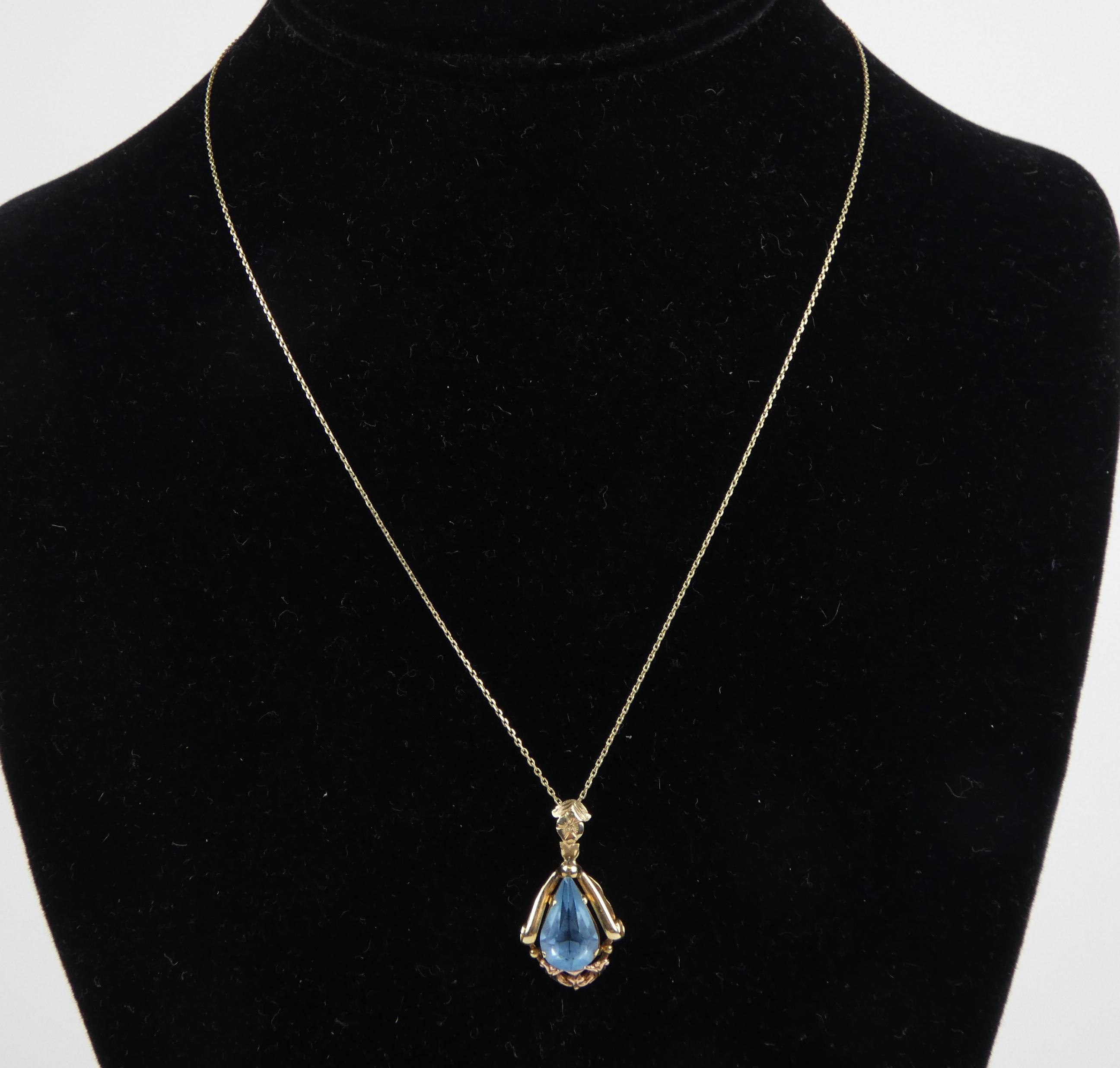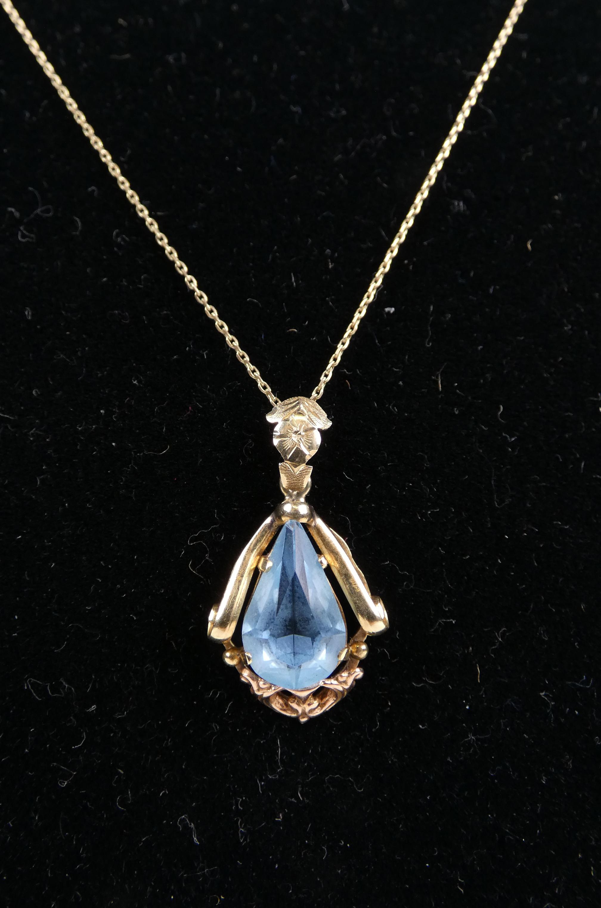 Bijou: Collier/chaîne et pendentif en or jaune 14K serti d'une pierre bleue P: 3,1g L: 44,5cm