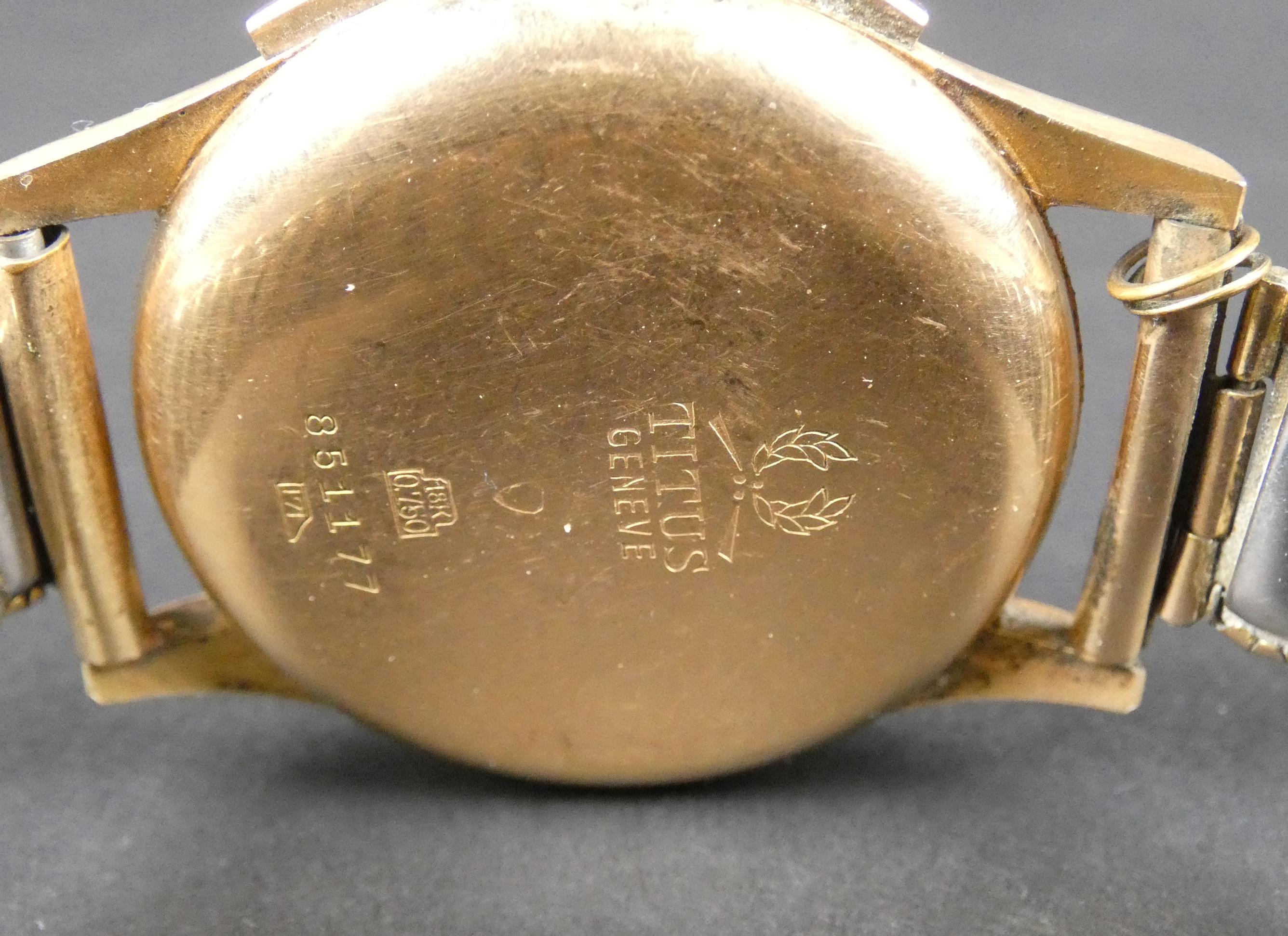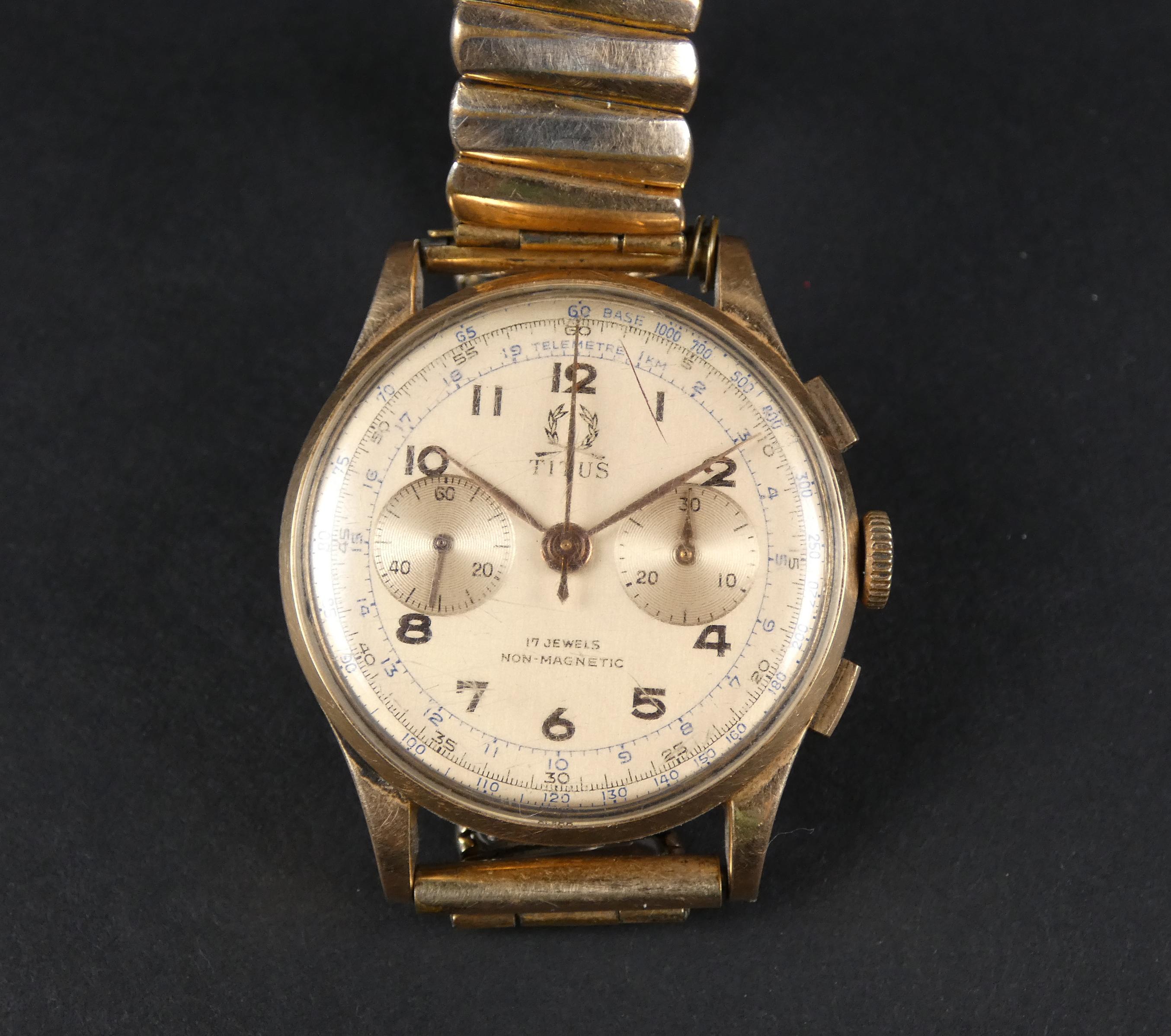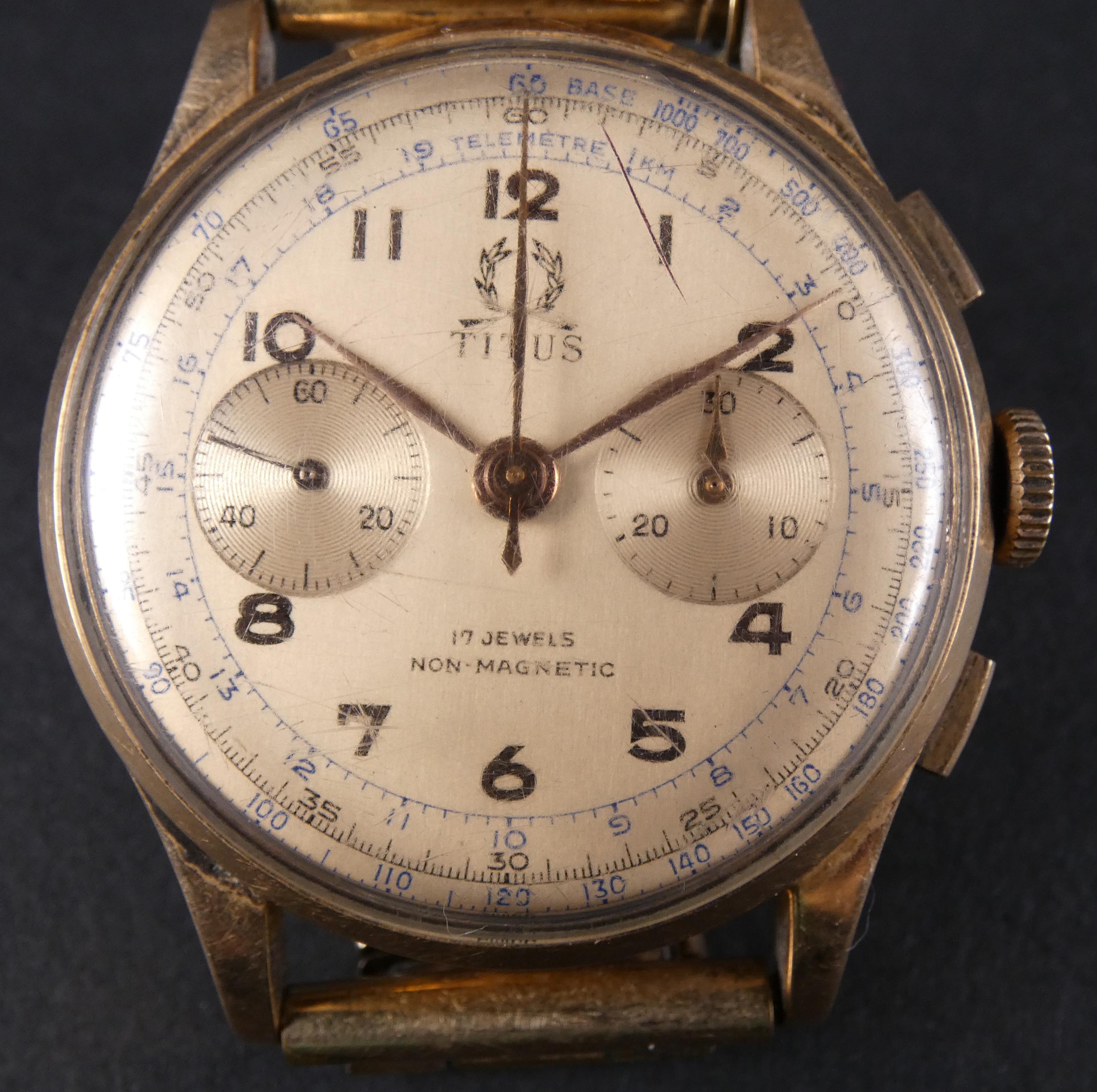 Bijou: montre chronographe TITUS boitier 14K cuvette arrière 18K mvt à remontoir (en état) D:38mm ptot:57,3g bracelet métal rapporté