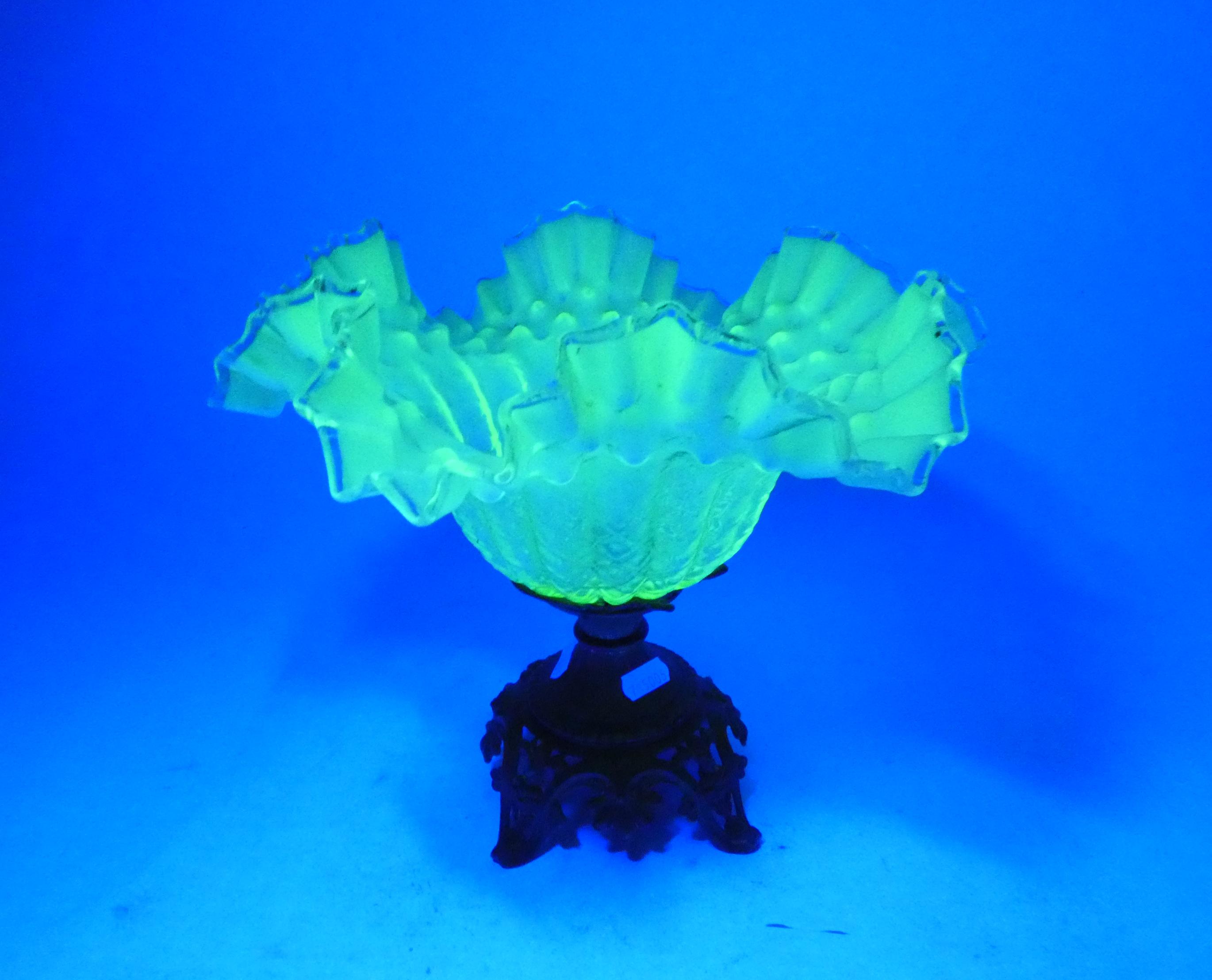 Objet: Coupe sur pied en verre moulé URANE/ ouraline et piètement en bronze H:26cm Diam:30cm
