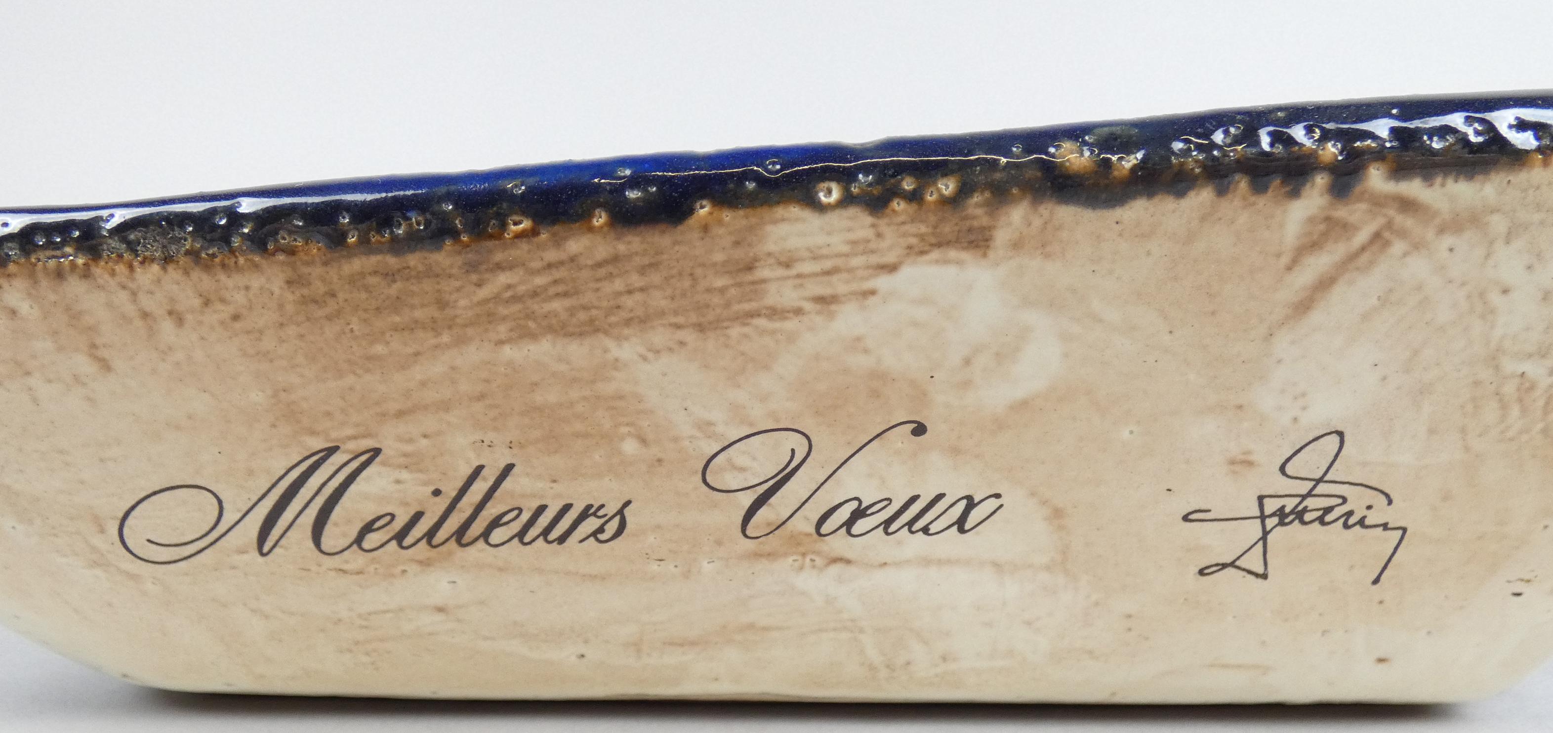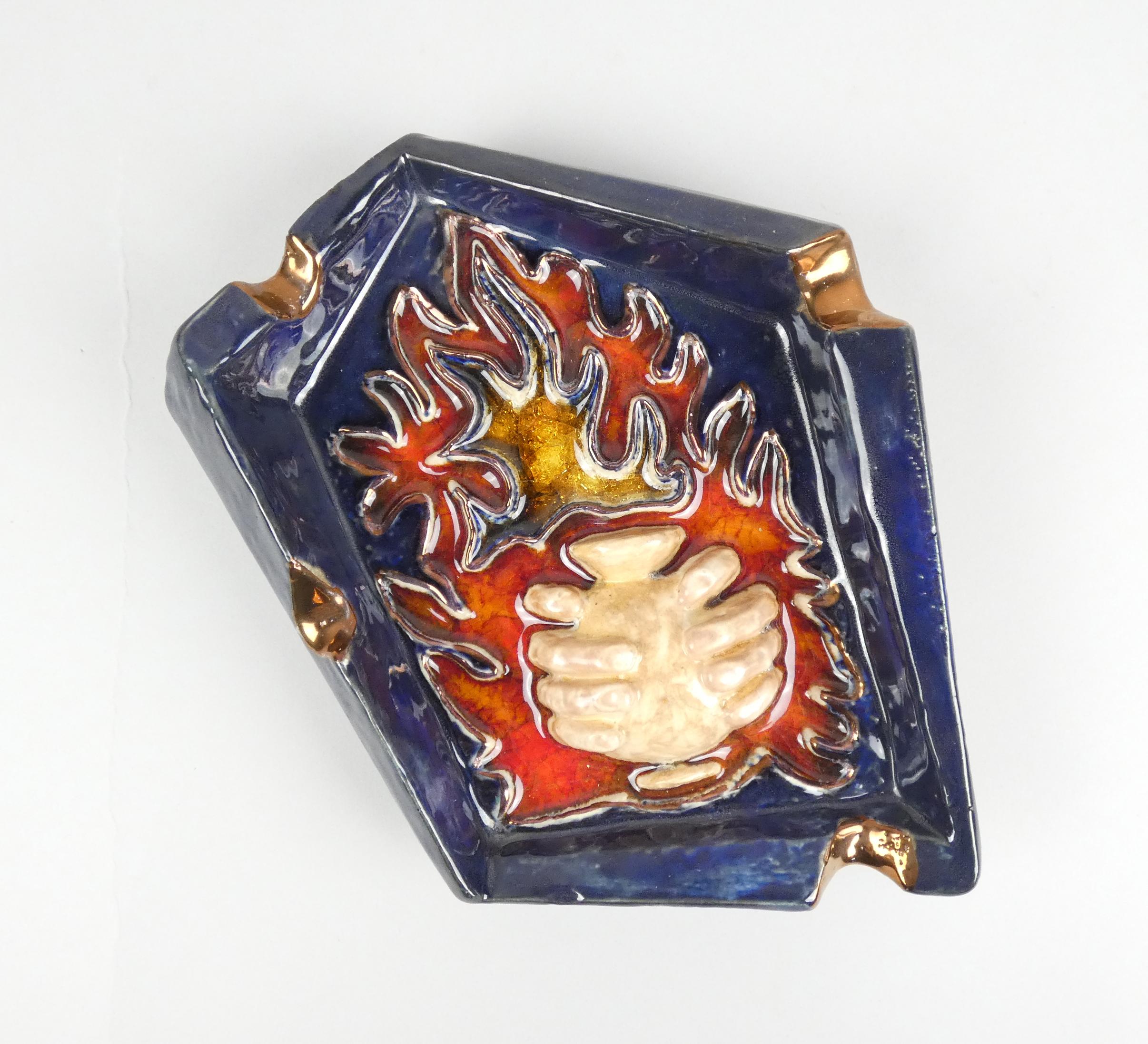 Céramique: Cendrier GUERIN (sous la base) faïence -mains tenant un vase avec flammes- 28x23cm inscription et signé sur le coté *GUERIN J.* (Jules) (1919, 1999)