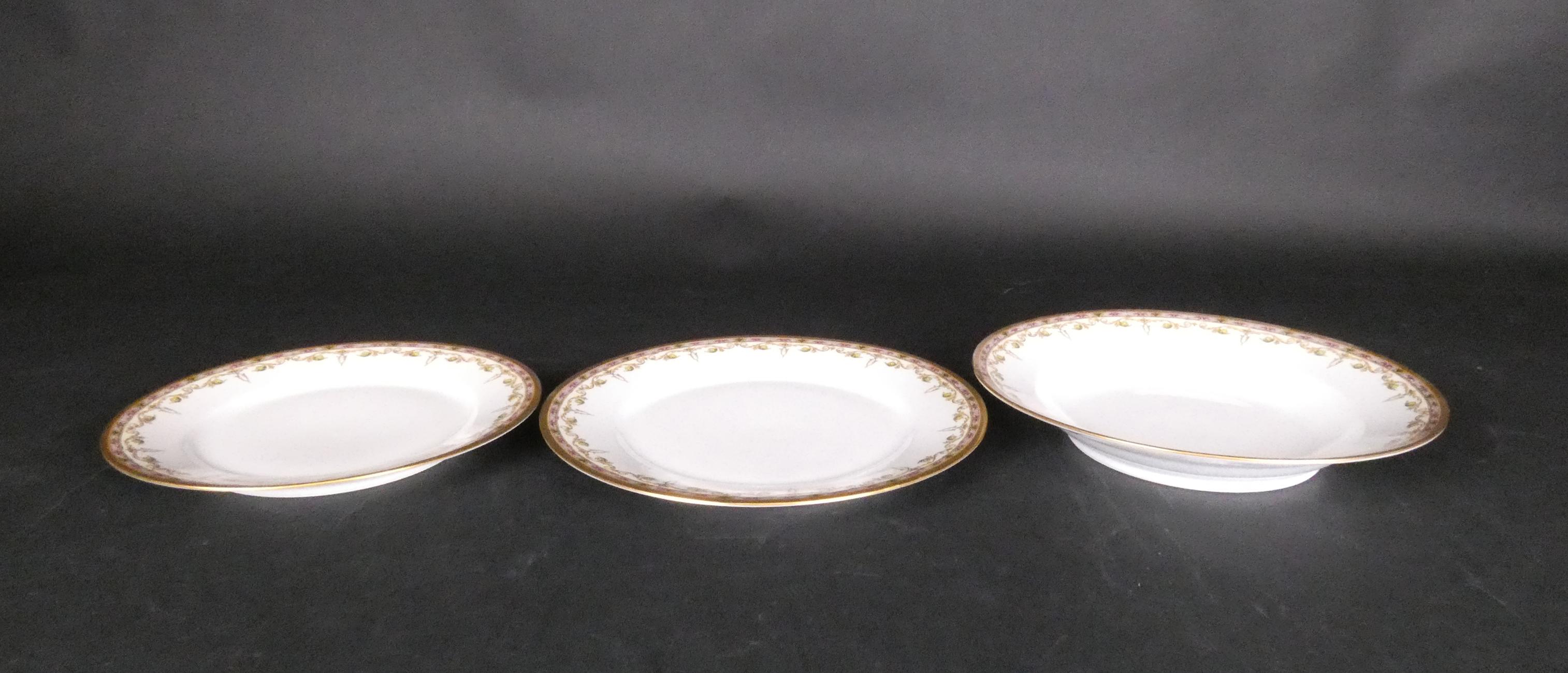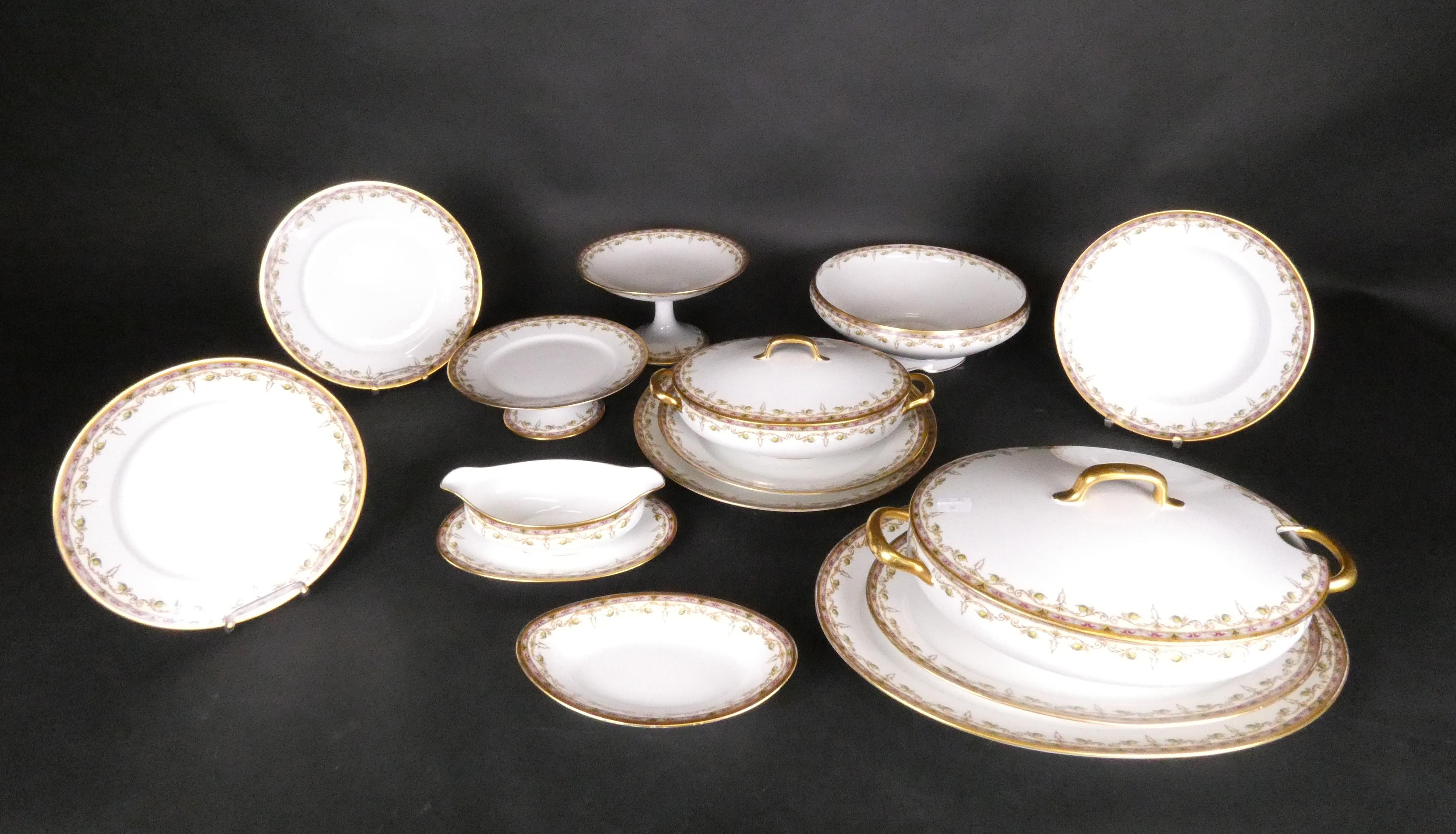 Céramique : service à dîner en porcelaine de LIMOGES (+/ - 70pcs) dont : soupière (rest) , 35 ass plates , 10 ass creuses , saladier (chev) , 3 plats ronds , 3 plats ovales.