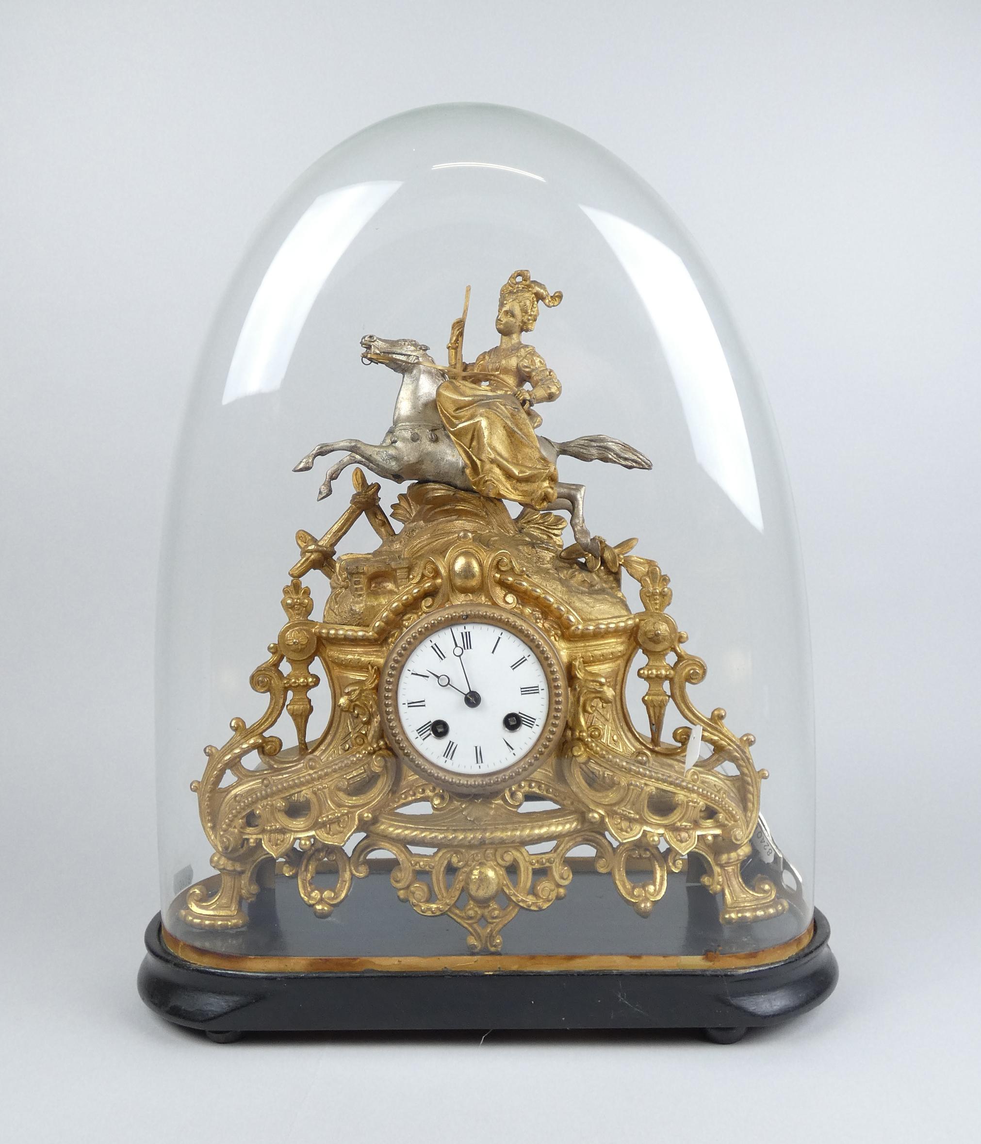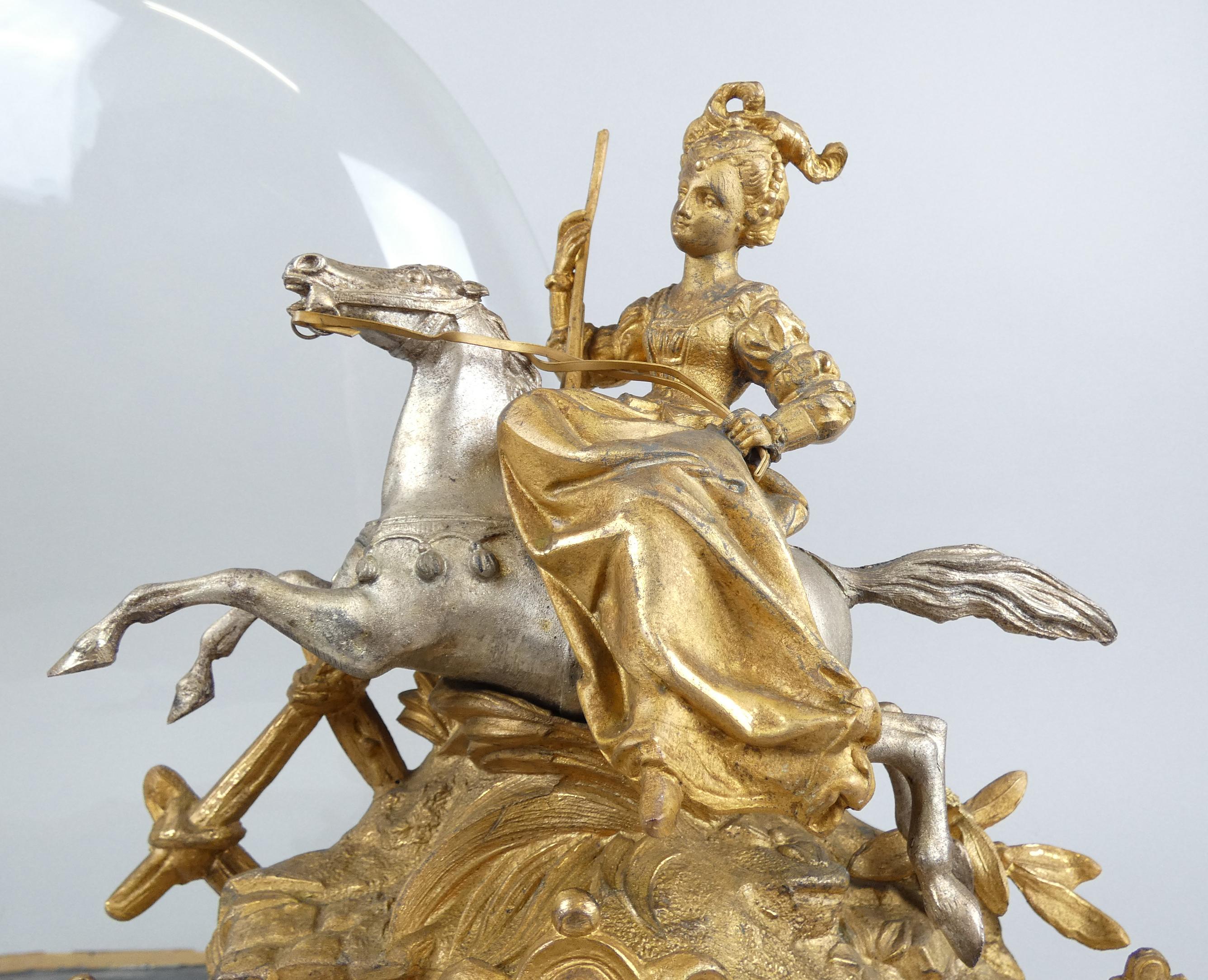 Horlogerie : Horloge régule doré NAPIII surmontée d'une dame au fusil sur son cheval H : 36cm sous globe en verre H tot : 48cm