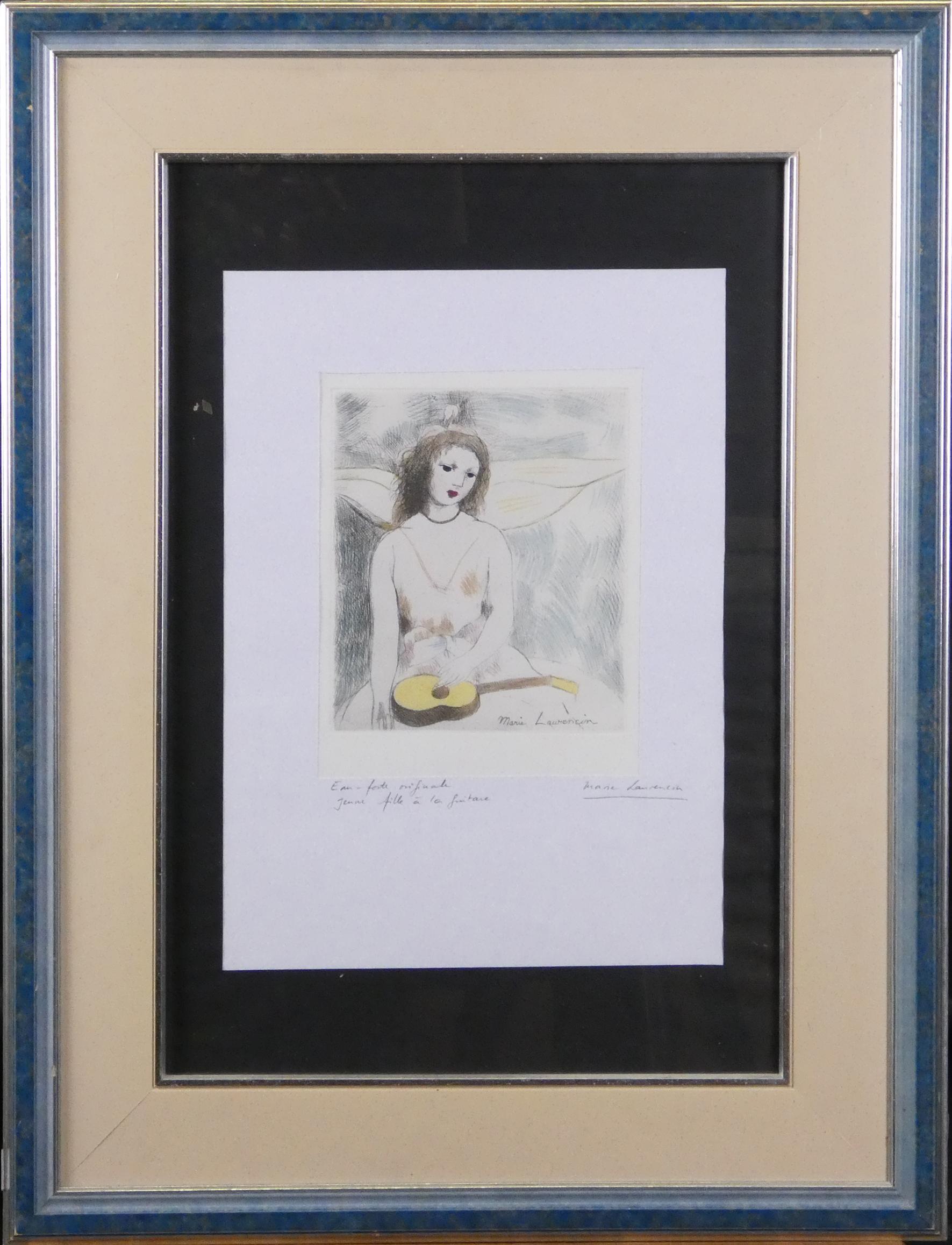 Estampe : Eau - forte couleur rehaussée à l'aquarelle - Jeune Fille à la Guitare - d'après LAURENCIN Marie