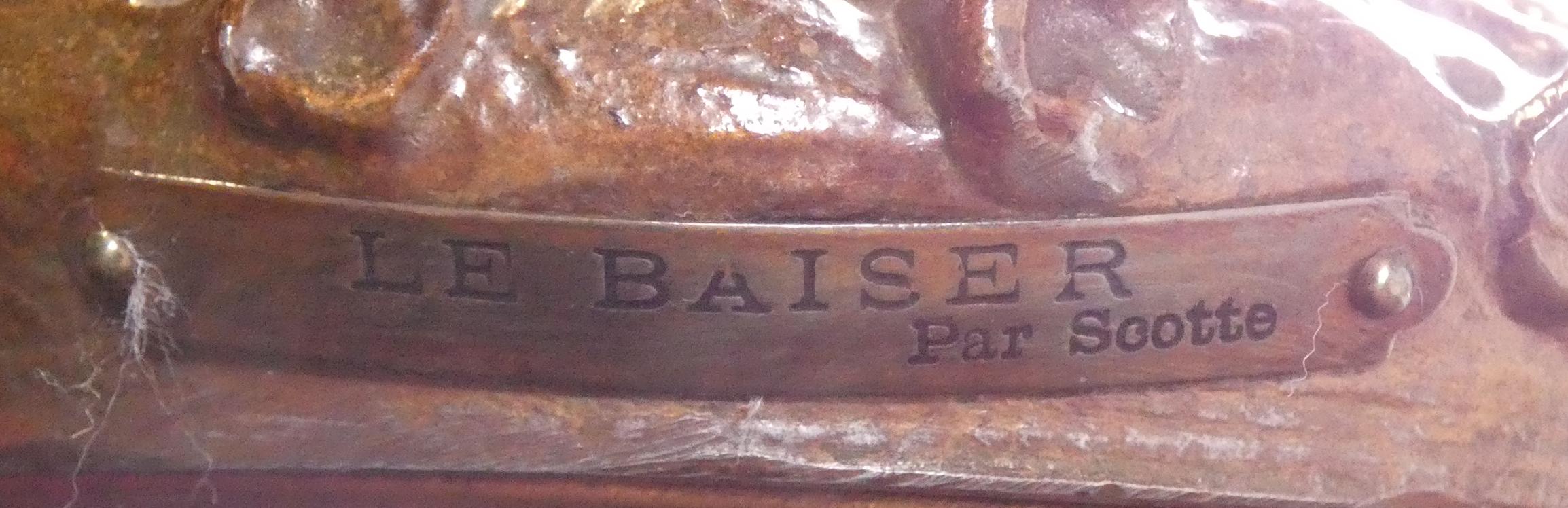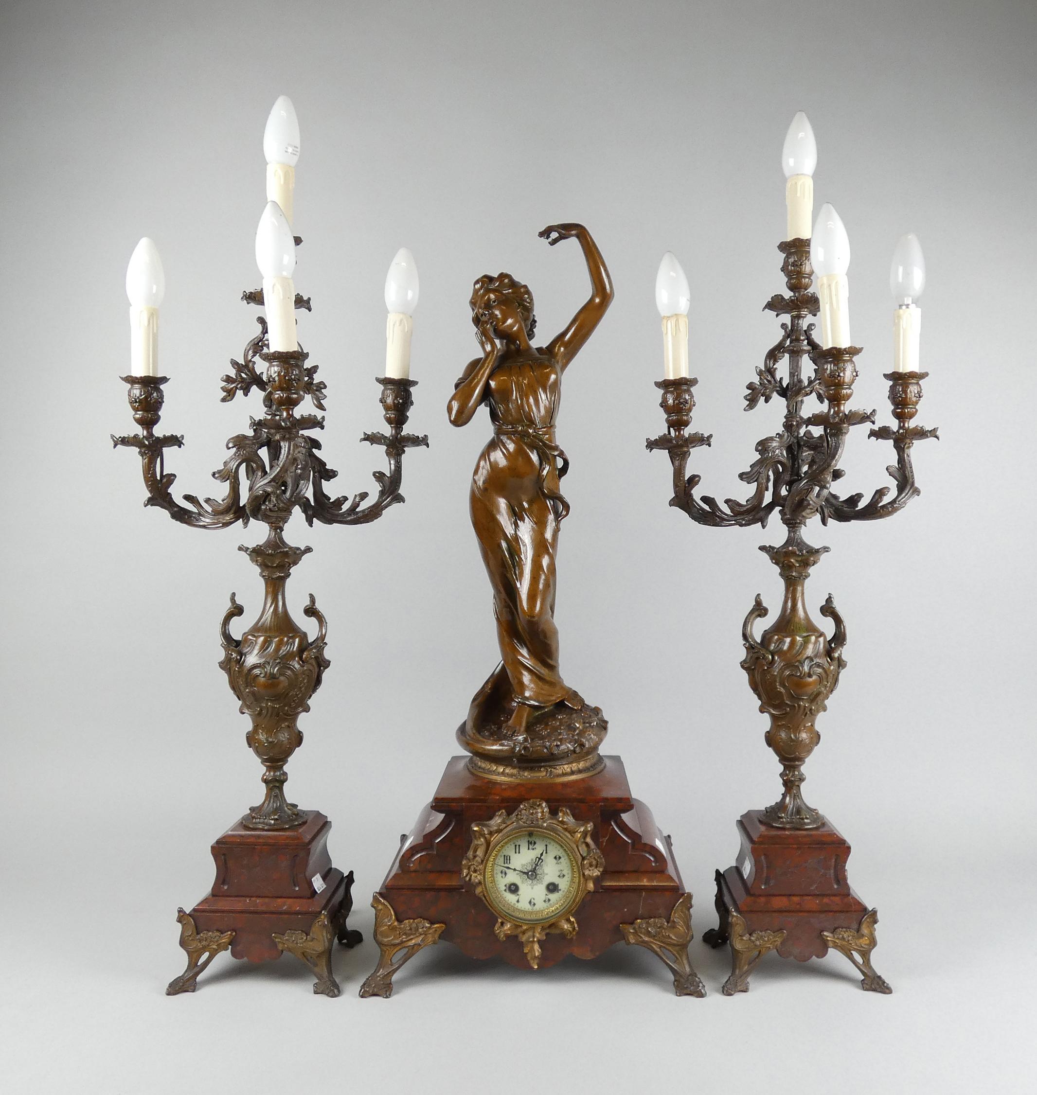 Horlogerie: Garniture de cheminée en régule (mqe) et marbre -Le baiser- d'après Scotte mouvement à sonnerie avec balancier et 2 chandeliers électrifiés (3pces)