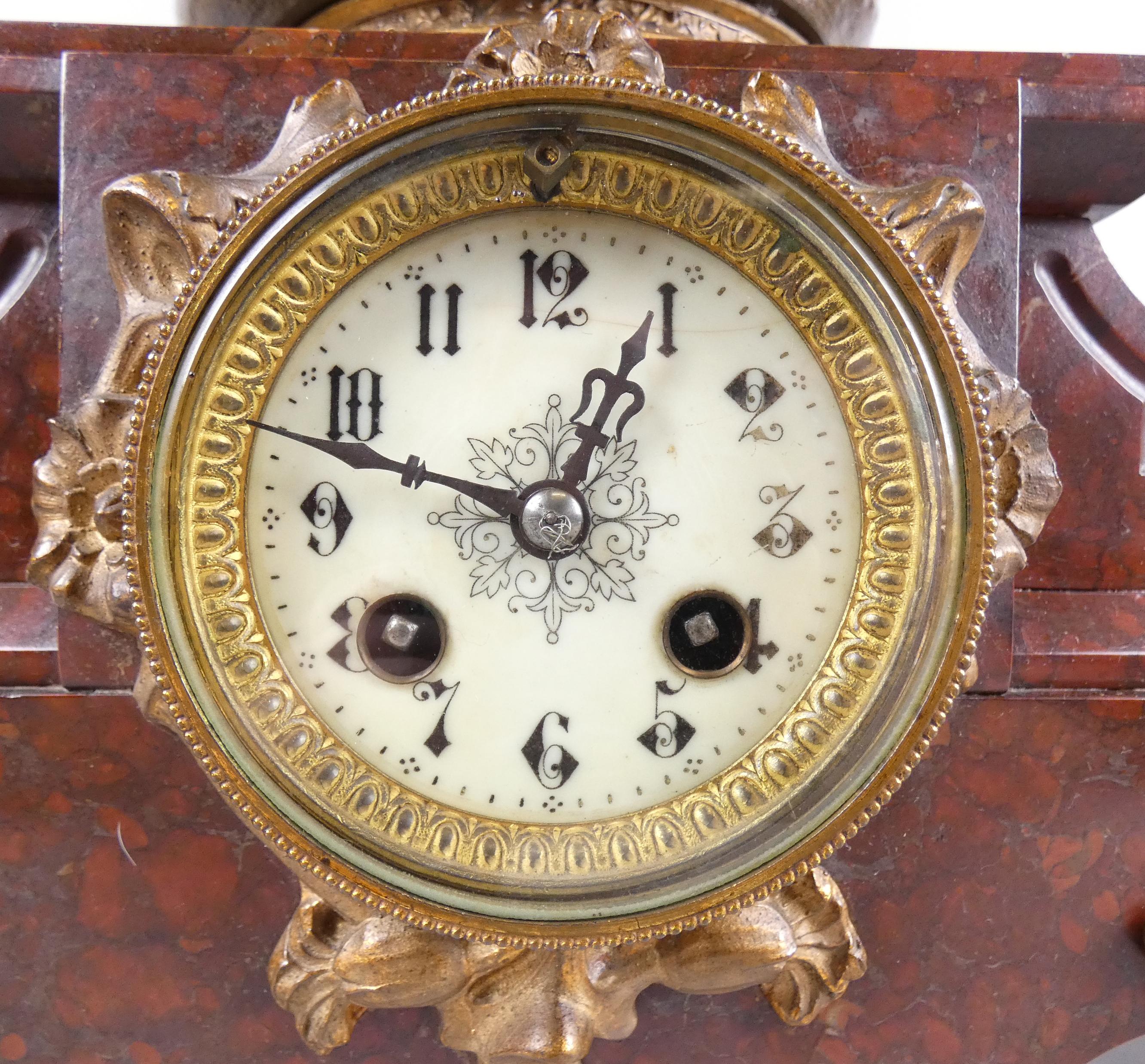 Horlogerie : Garniture de cheminée en régule (mqe) et marbre - Le baiser - d'après Scotte mouvement à sonnerie avec balancier et 2 chandeliers électrifiés (3pces)