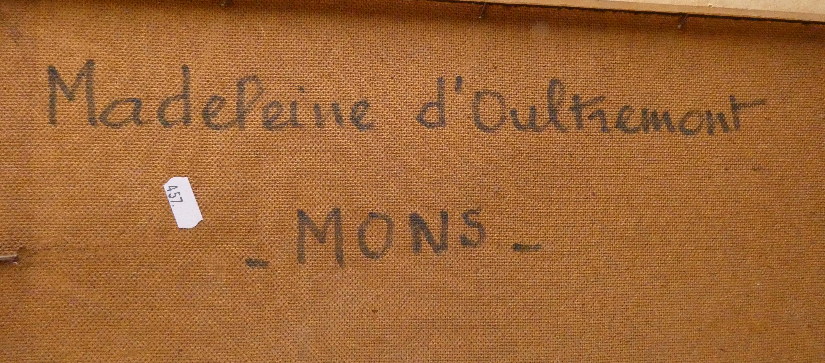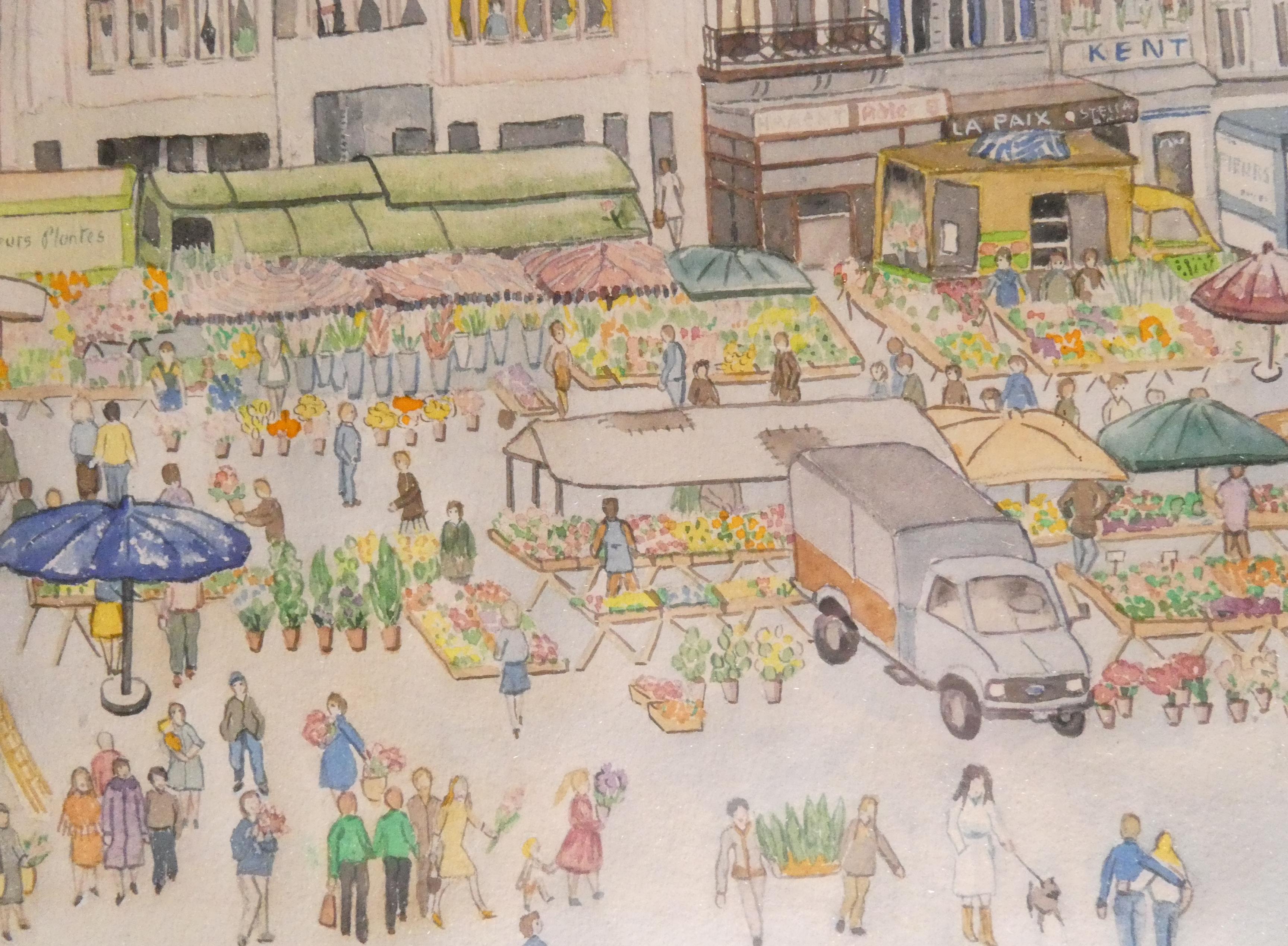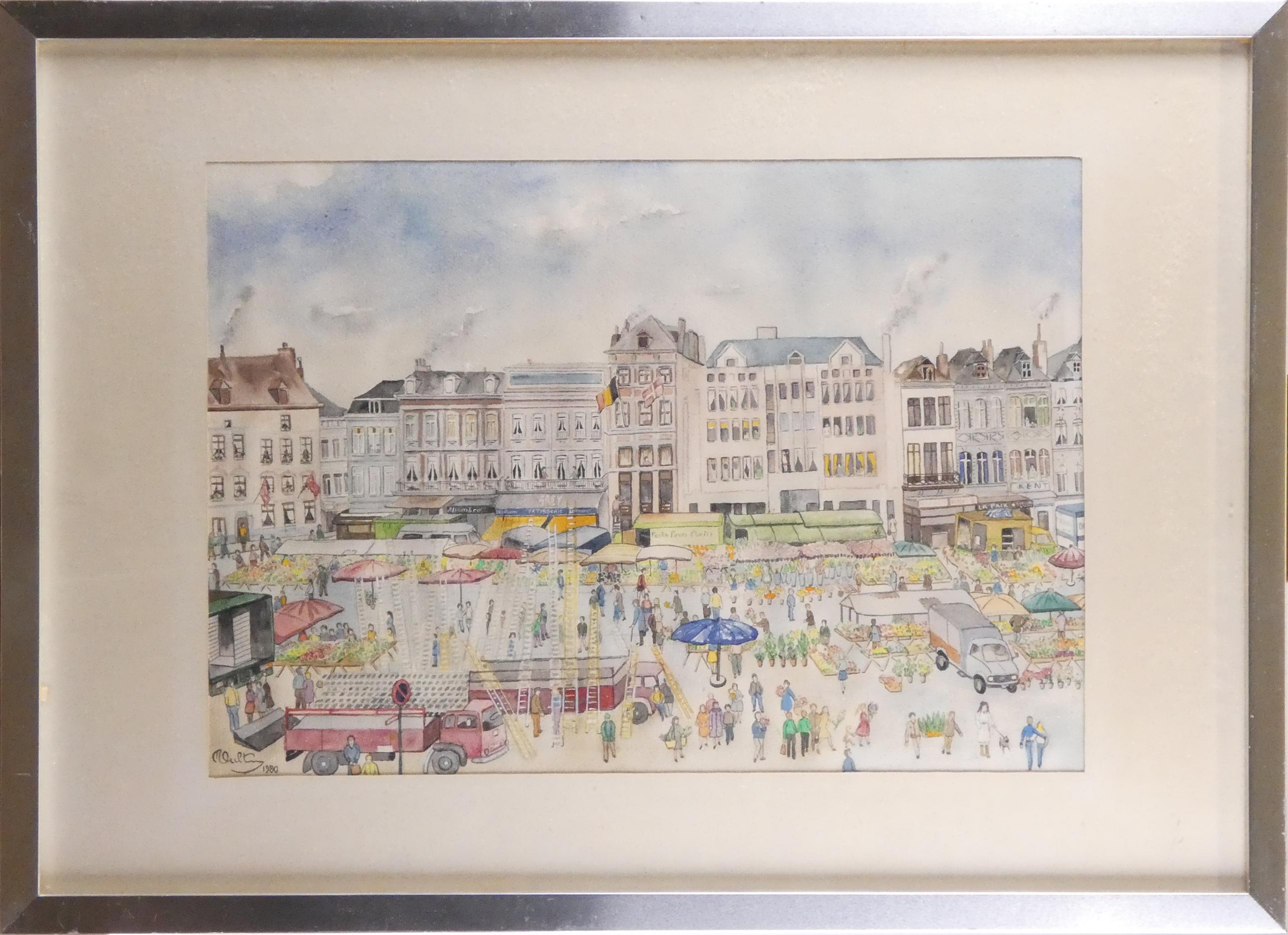 Tableau aquarelle -Marché aux fleurs Grand Place de Mons- daté 1980 signé D'OULTREMONT Madeleine (XX, XXI) 35x50cm cadre alu sous verre