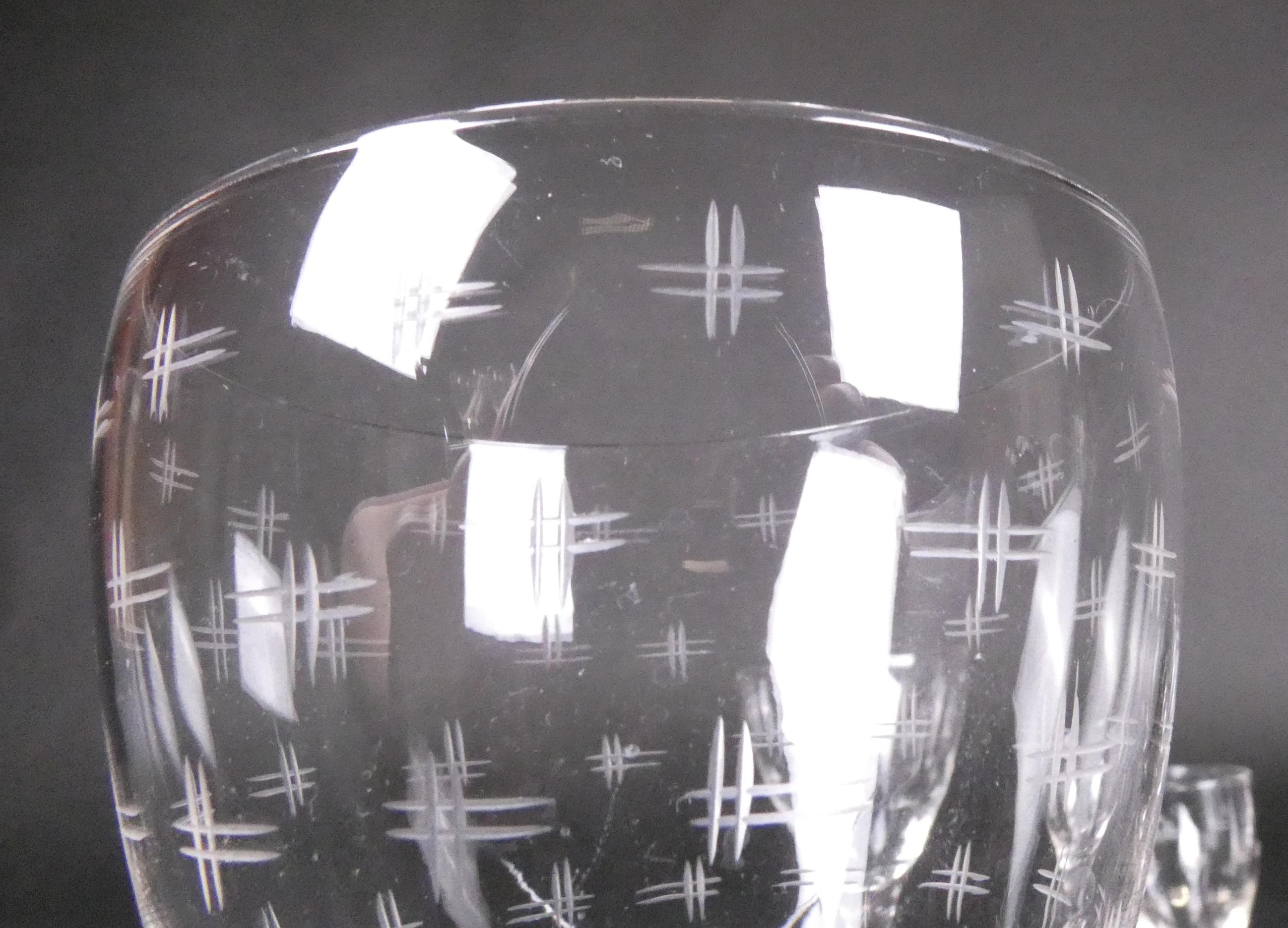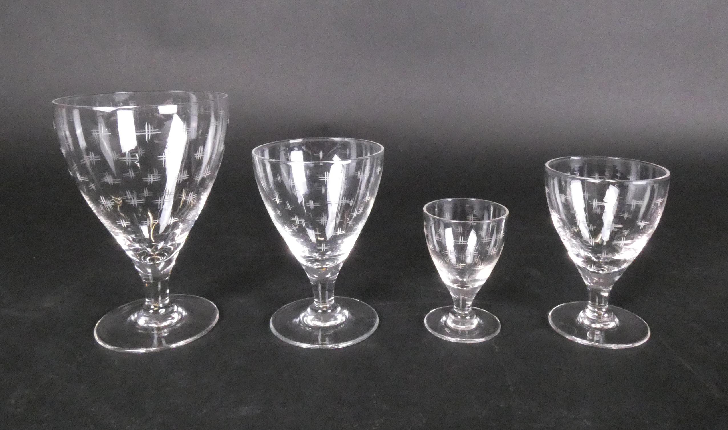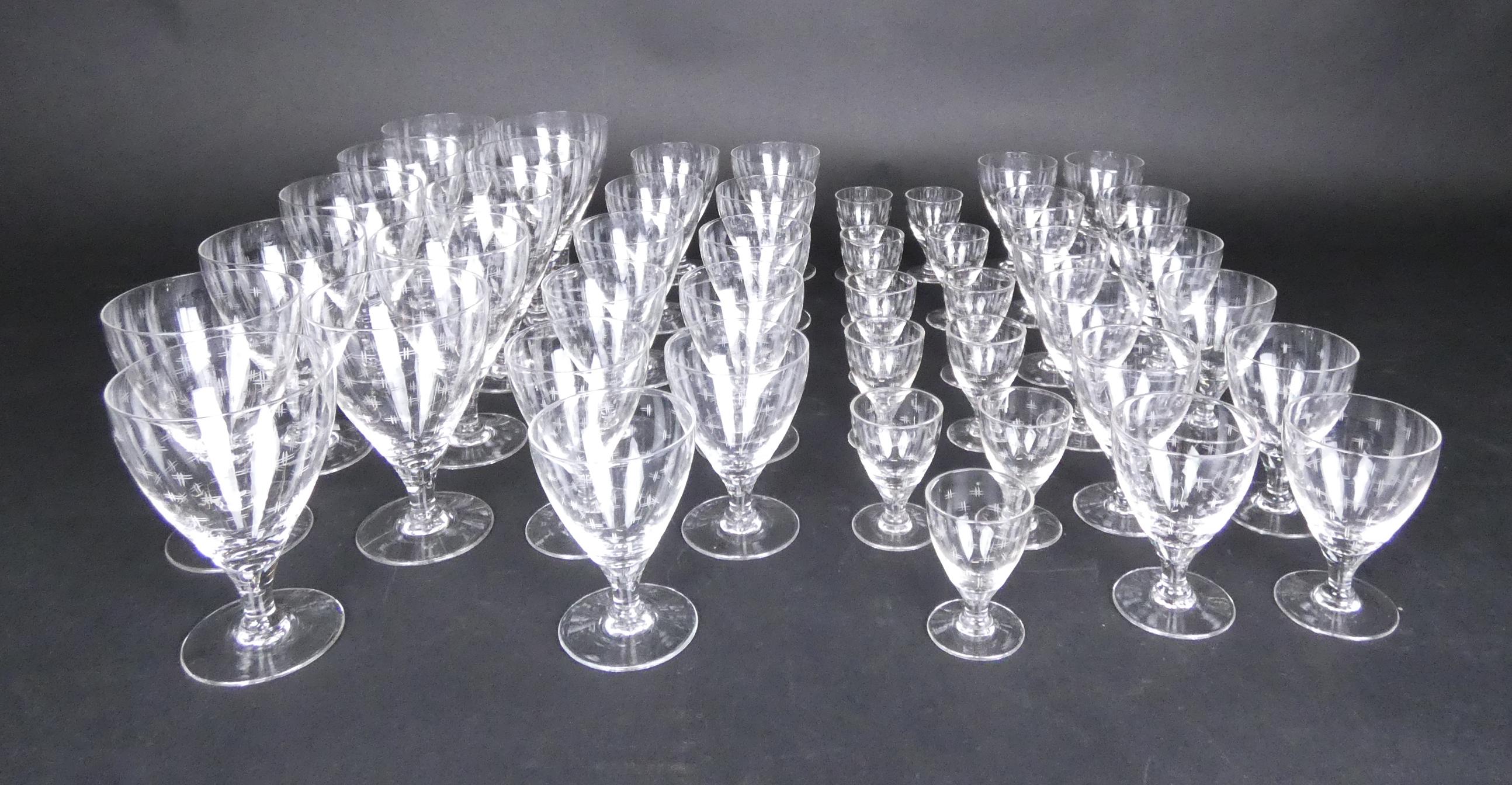 Verrerie: Service de verres en cristal (45pcs): 11 verres à eau, 11 verres à vin rouge, 12 verres à vin blanc et 11 verres à liqueur