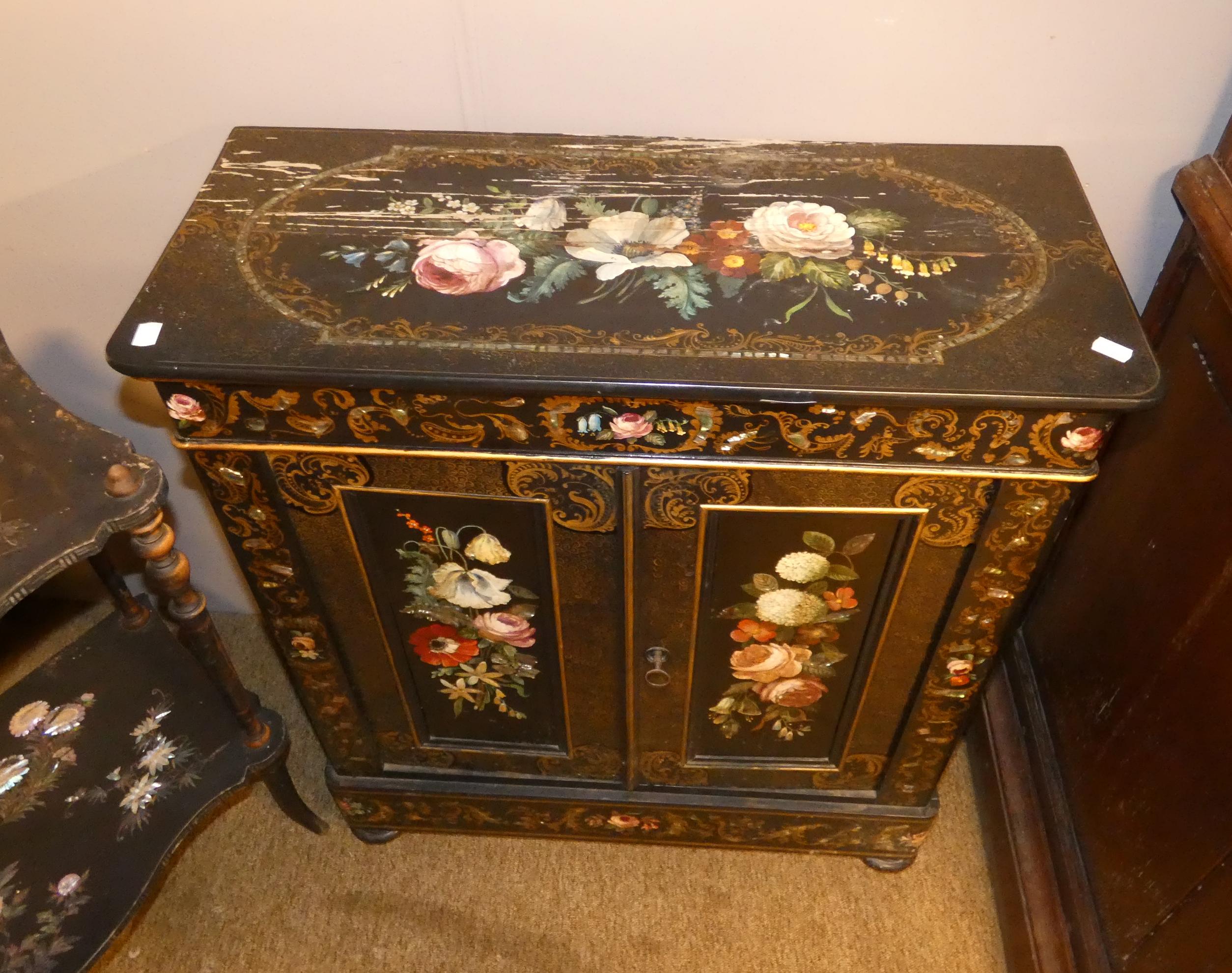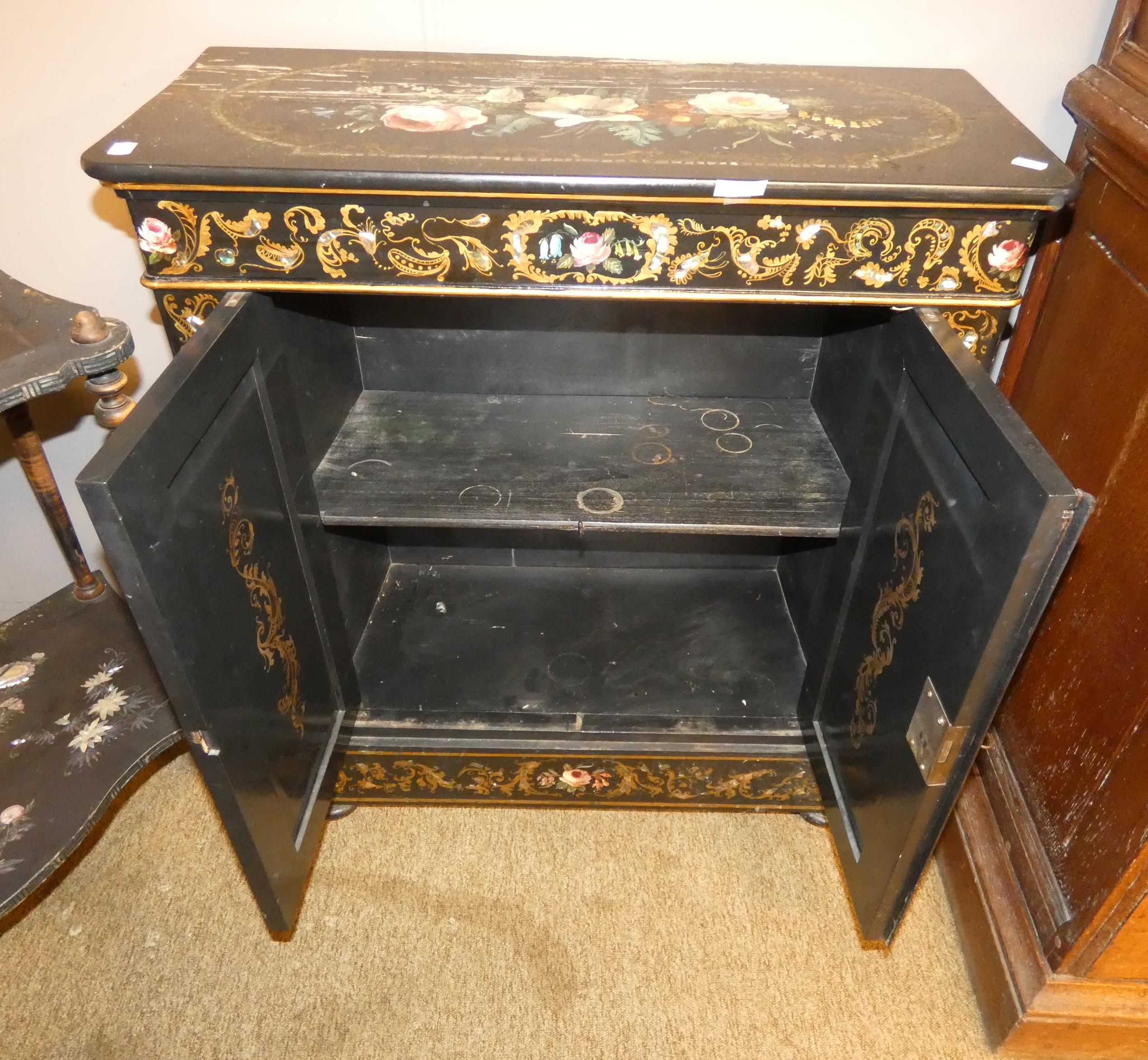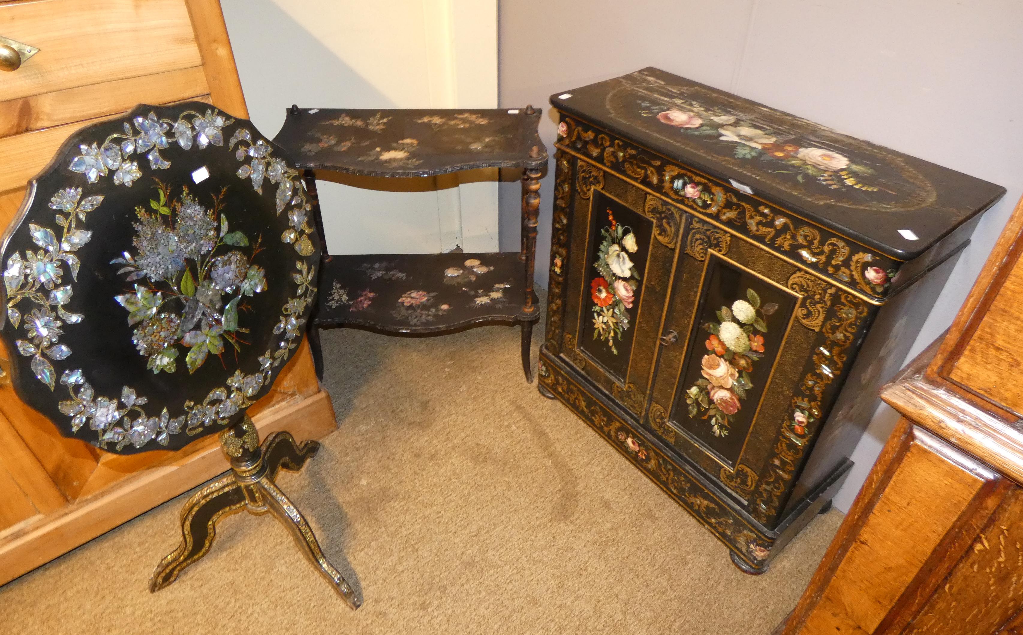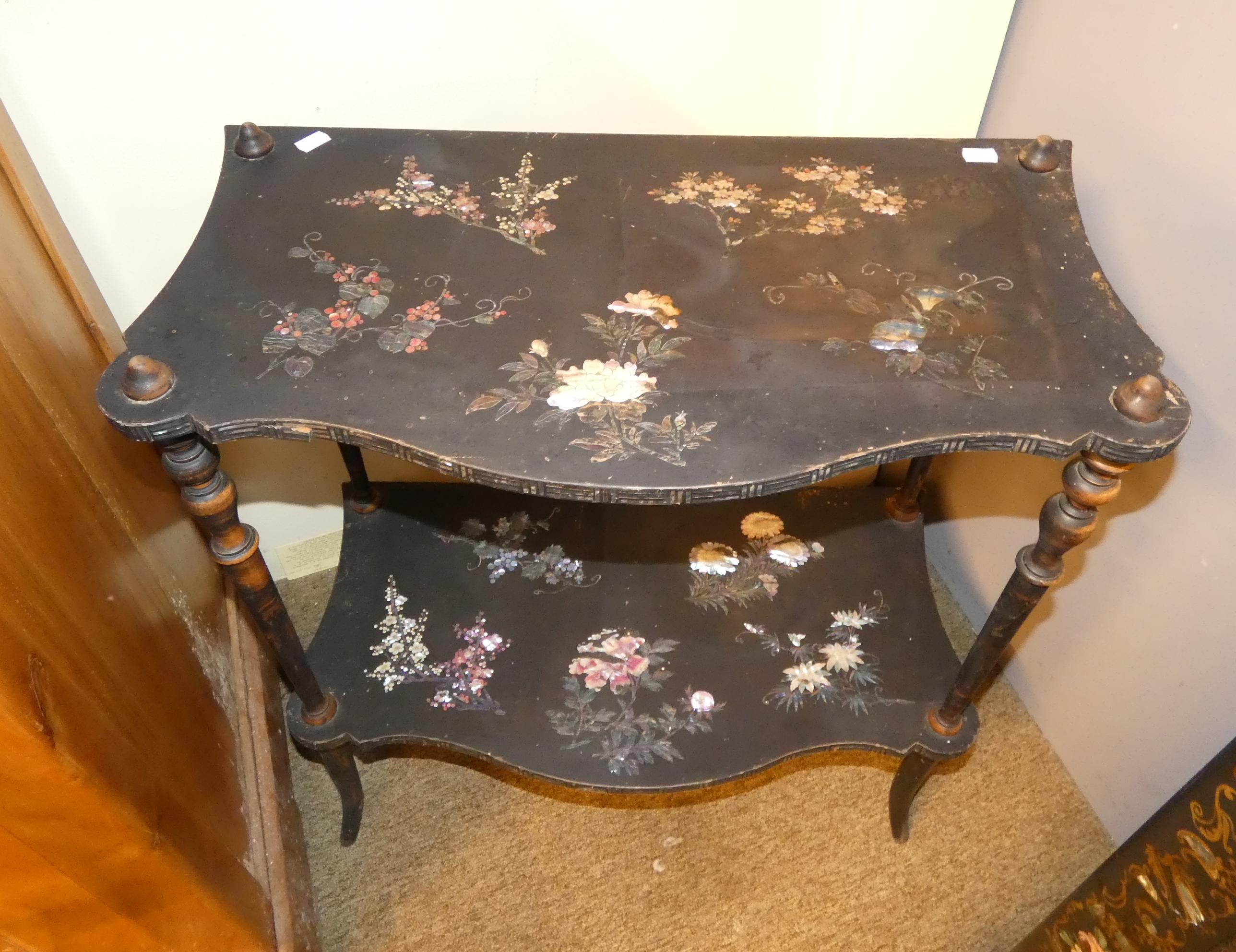Meuble: (3pcs) Dressoir en bois laqué (acc) décor peint rehauts d'or incr. de nacre + guéridon tilt top décor de nacre + desserte à double plateau NAP III incr. nacre