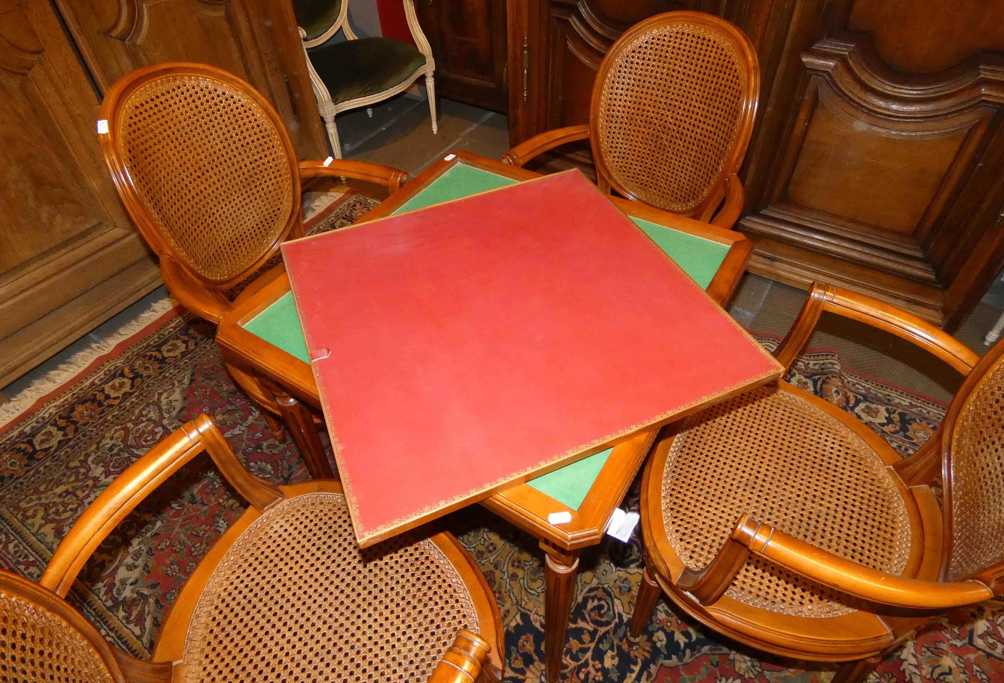 Meuble: table à jeux en bois décor de marqueterie + 4 chaises