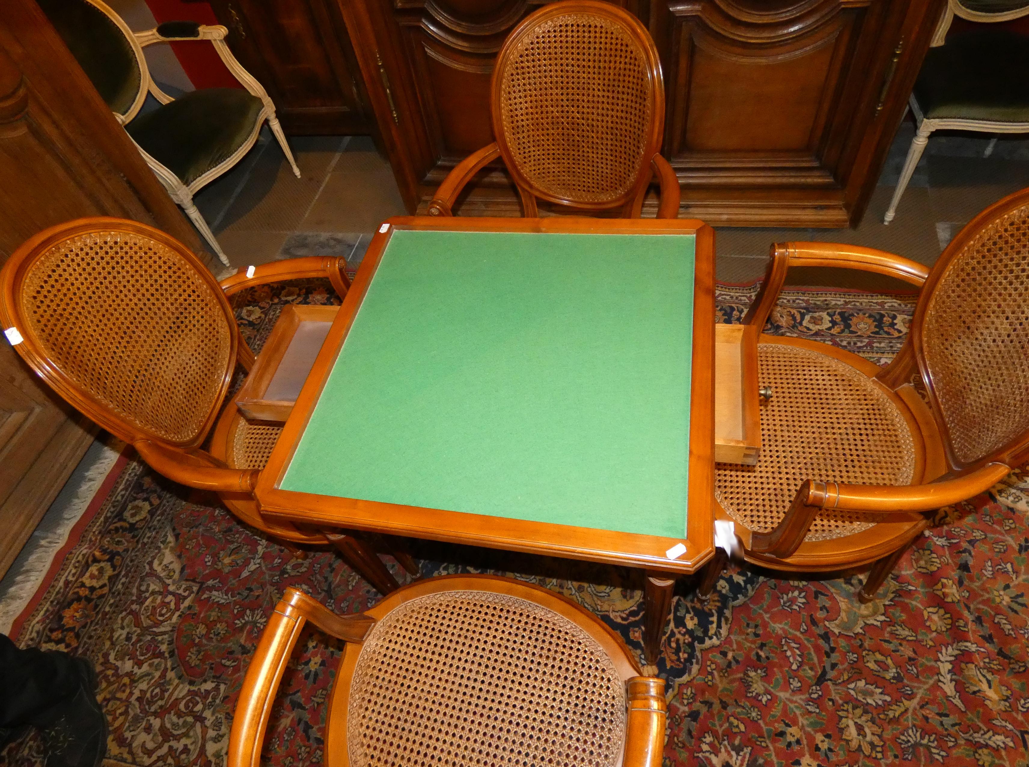 Meuble : table à jeux en bois décor de marqueterie + 4 chaises