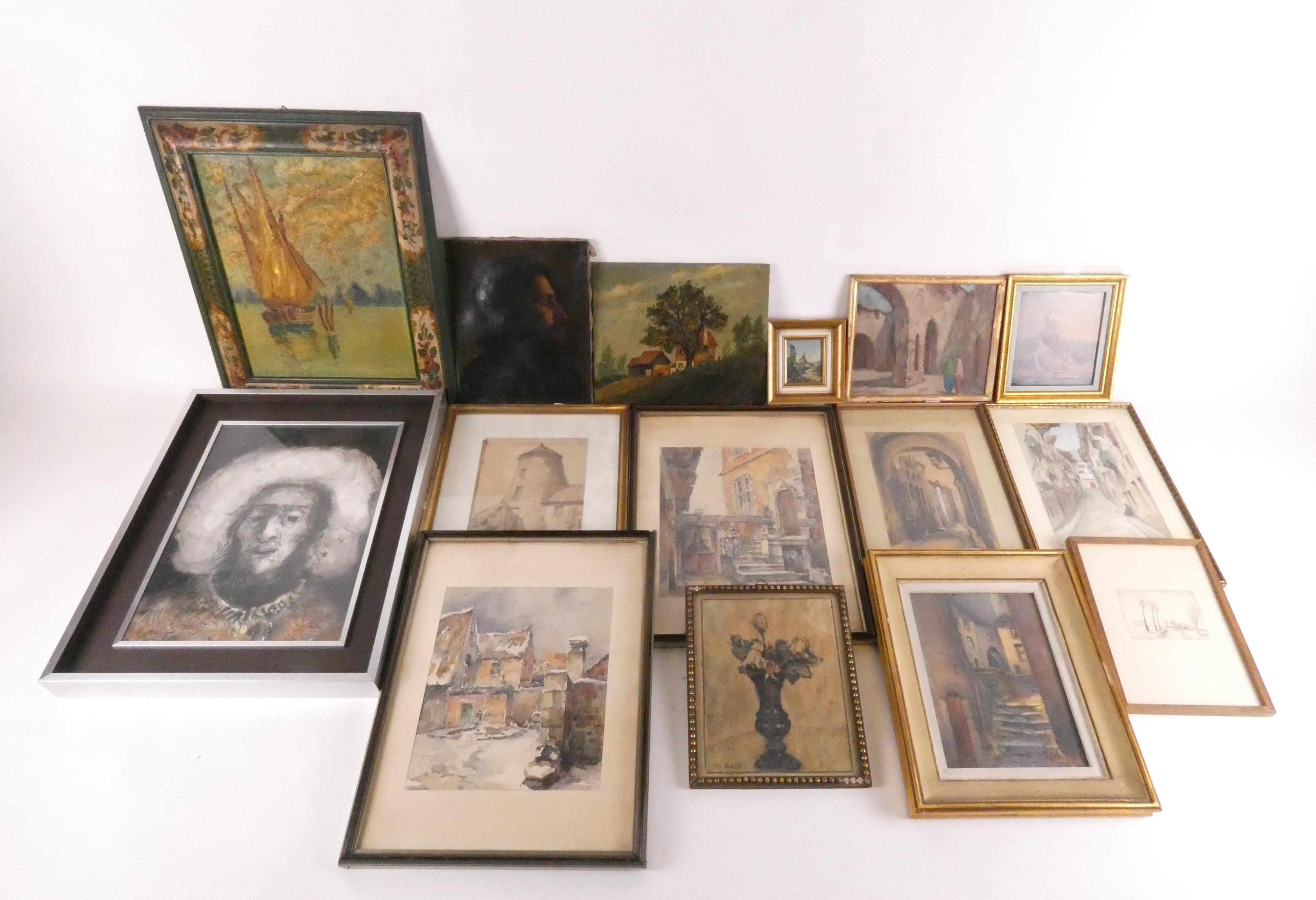 Tableau : Important lot d'aquarelles , dessins , huile. (24pcs) de différents artistes dont : Albert J. , Anis C. , Pâques C. , Janssen W. , Lawson..