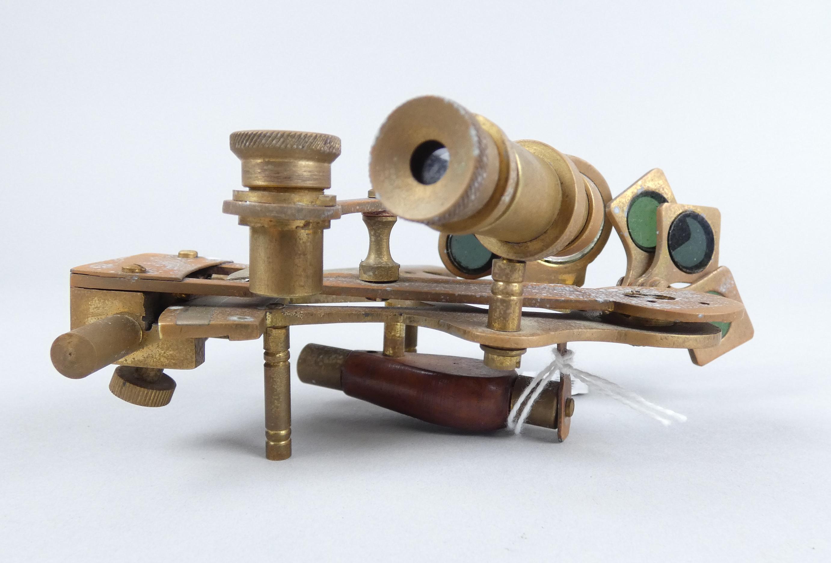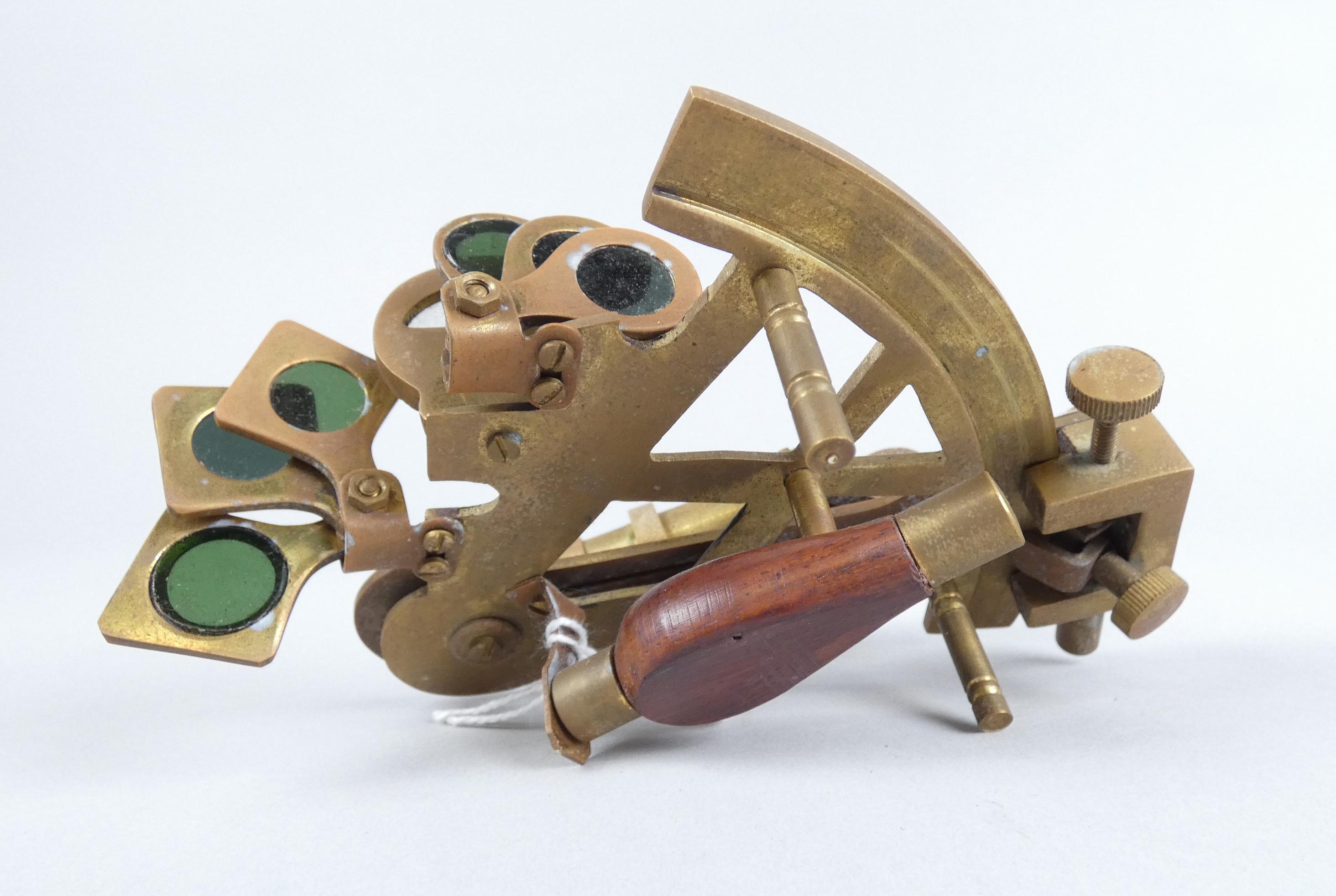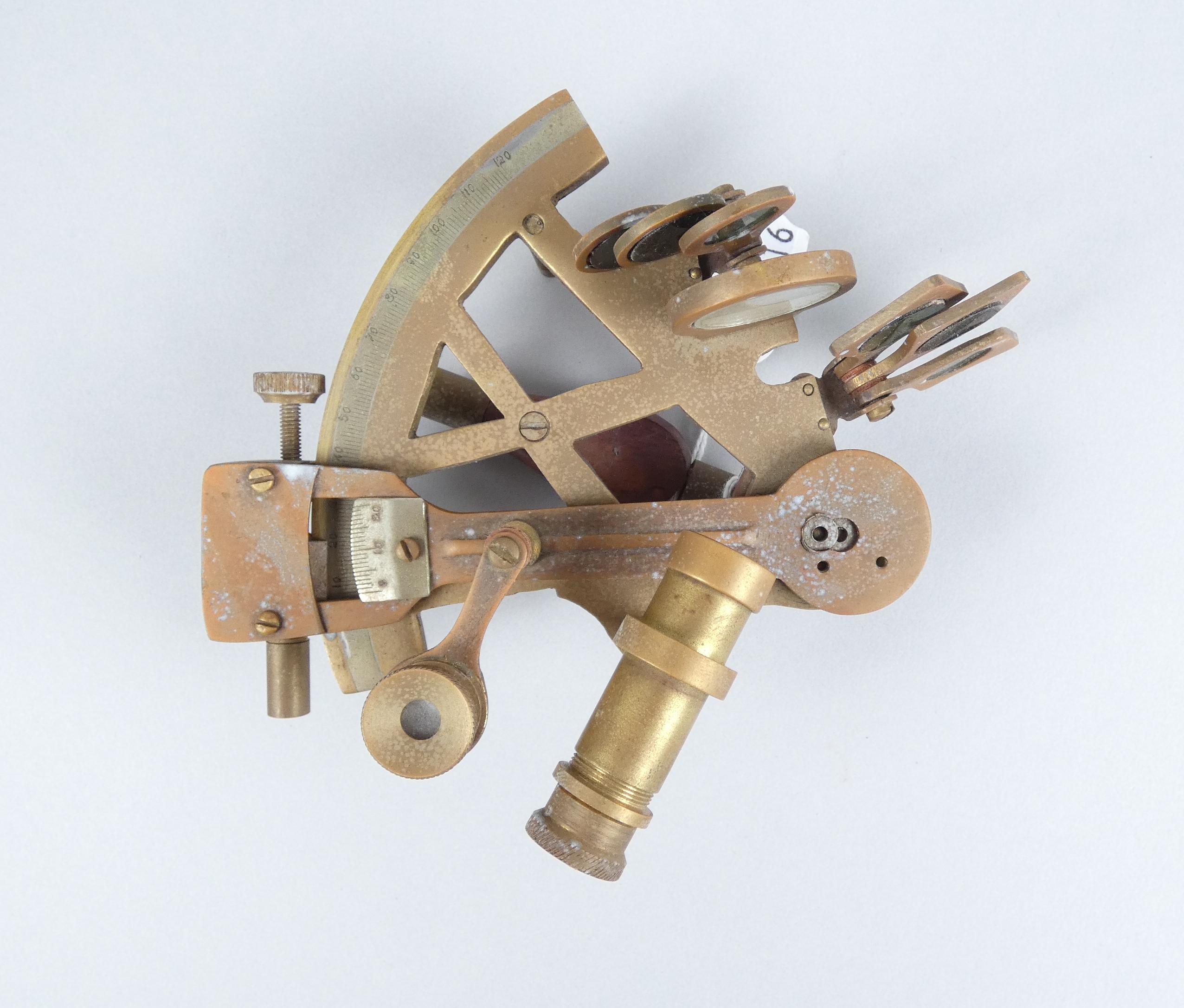 Objet: Instrument de marine en laiton -Sextant- (traces d'usures, pt oxy) dans sa boite 8x14x15cm