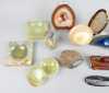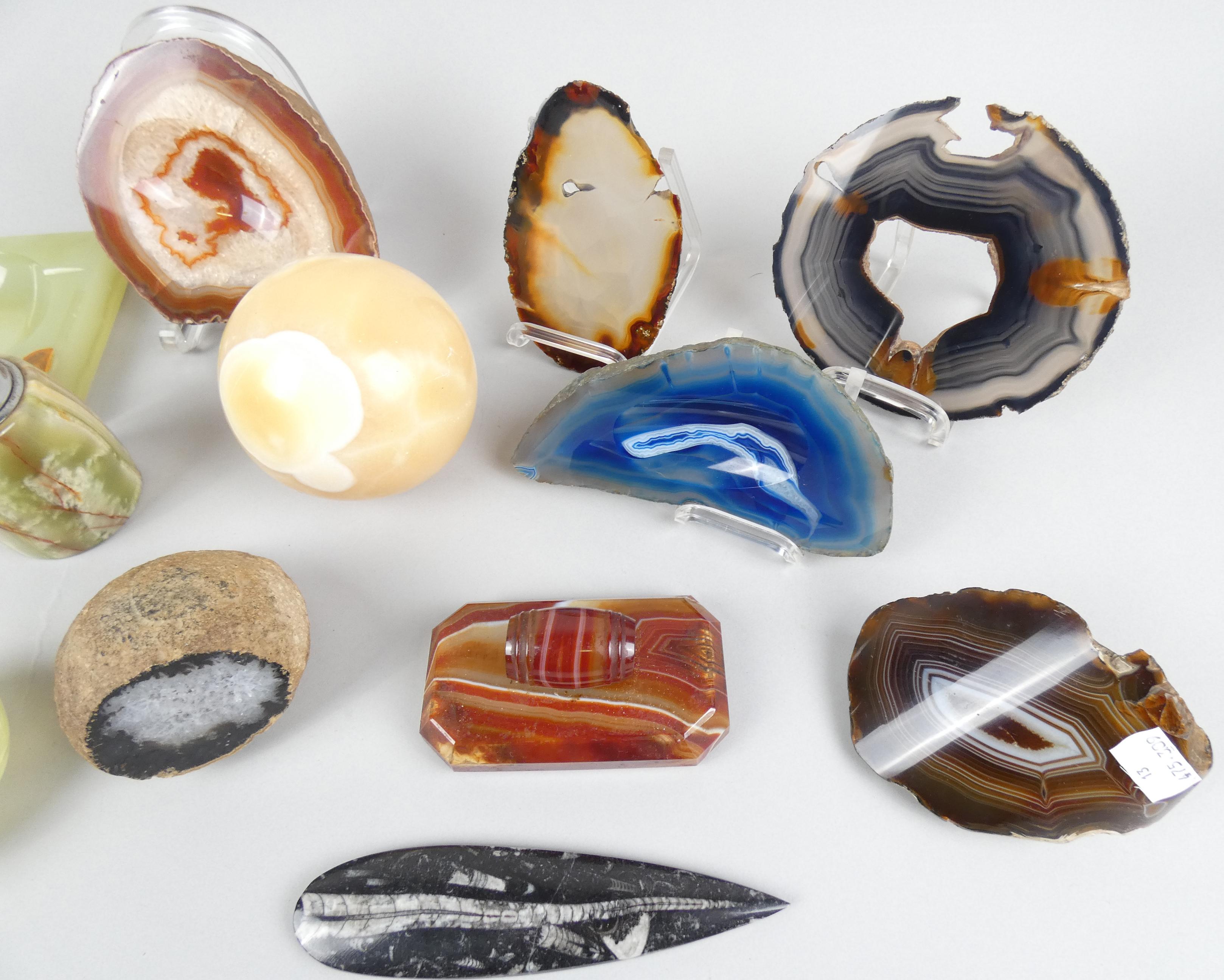 Collection : Agate dont vide - poche et tranches (7) onyx vide - poche , boite (écl) et briquet de table (4) sphère en calcite jaune? (1) fossile orthoceras (1) (13pcs)