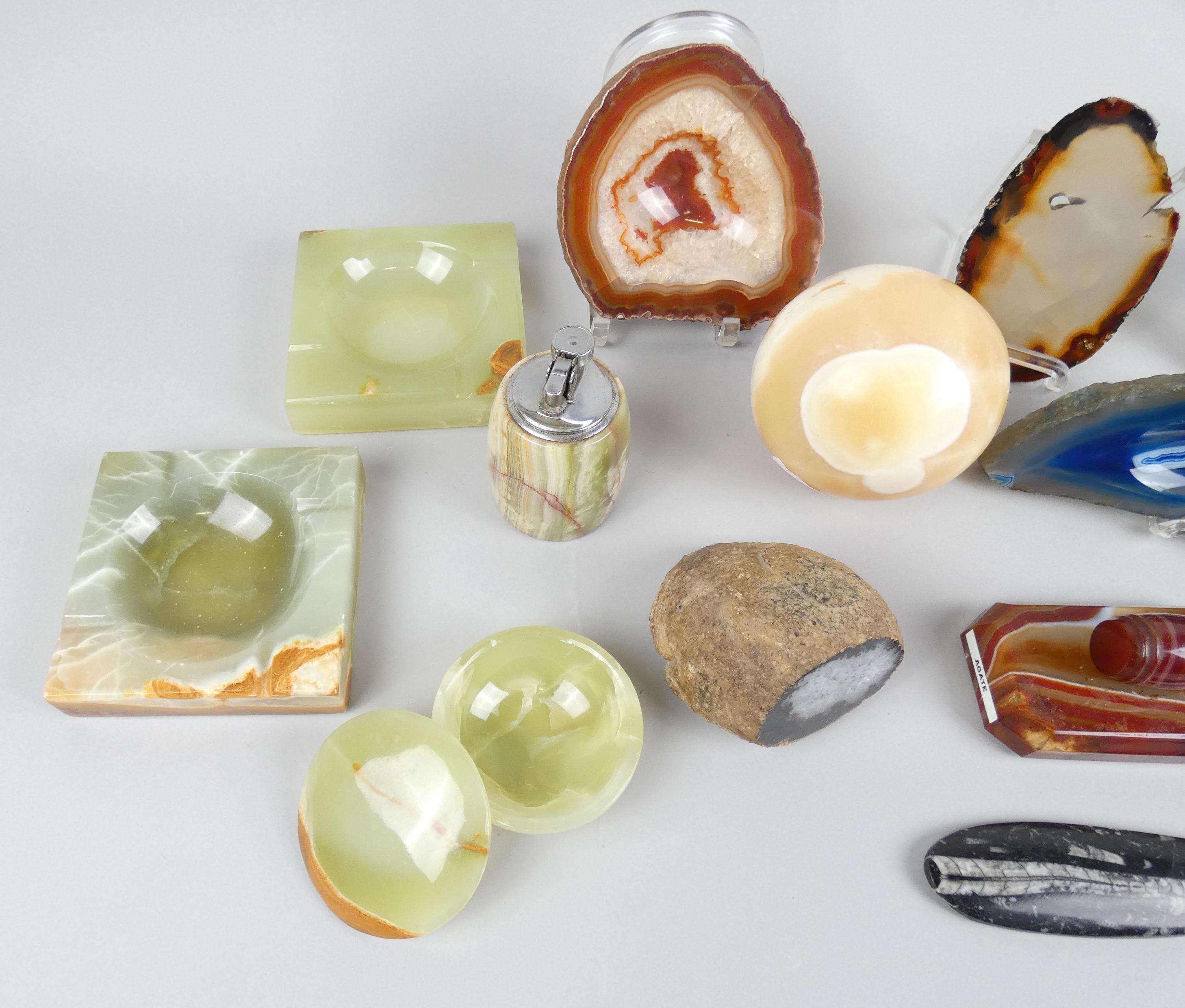 Collection: Agate dont vide-poche et tranches (7) onyx vide-poche, boite (écl) et briquet de table (4) sphère en calcite jaune? (1) fossile orthoceras (1) (13pcs)