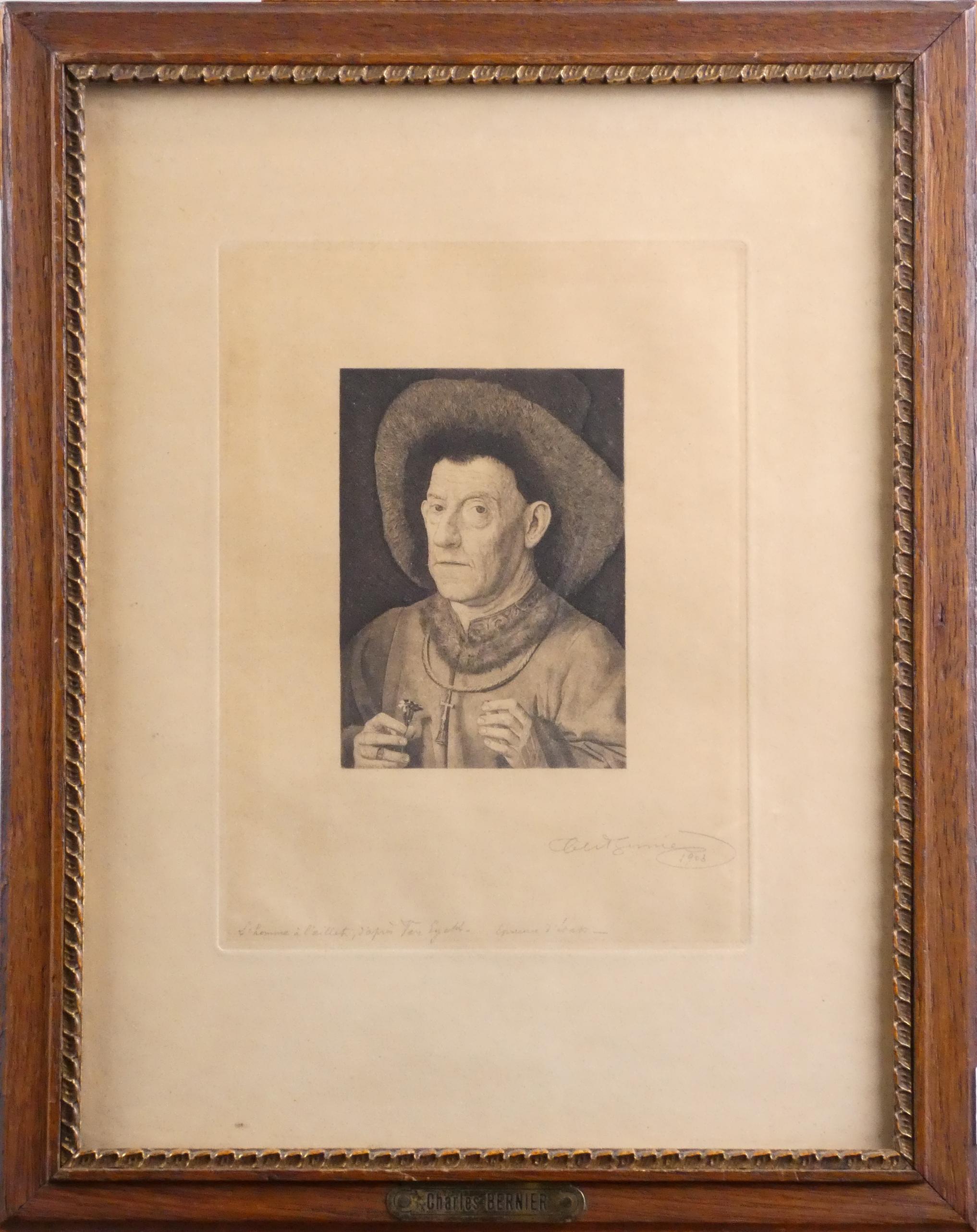 Estampe: Eau-forte - L'homme à l'Oeillet d'après Van EYCK- daté 1903 Epreuve d'Etat signé *BERNIER C.* (Charles) (1871, 1950) 11,5x8cm cadre bois sous verre