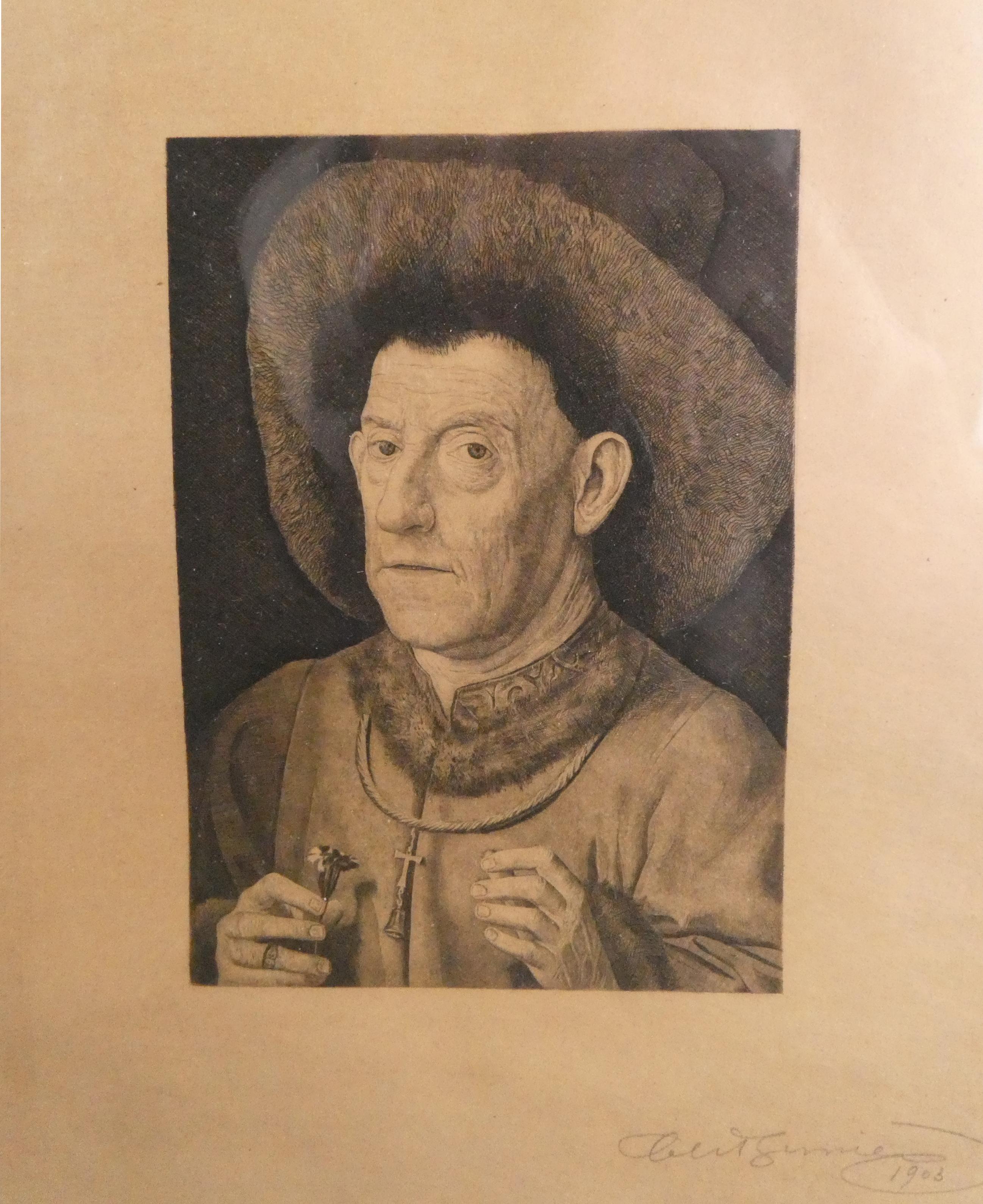 Estampe : Eau - forte - L'homme à l'Oeillet d'après Van EYCK - daté 1903 Epreuve d'Etat signé BERNIER Charles