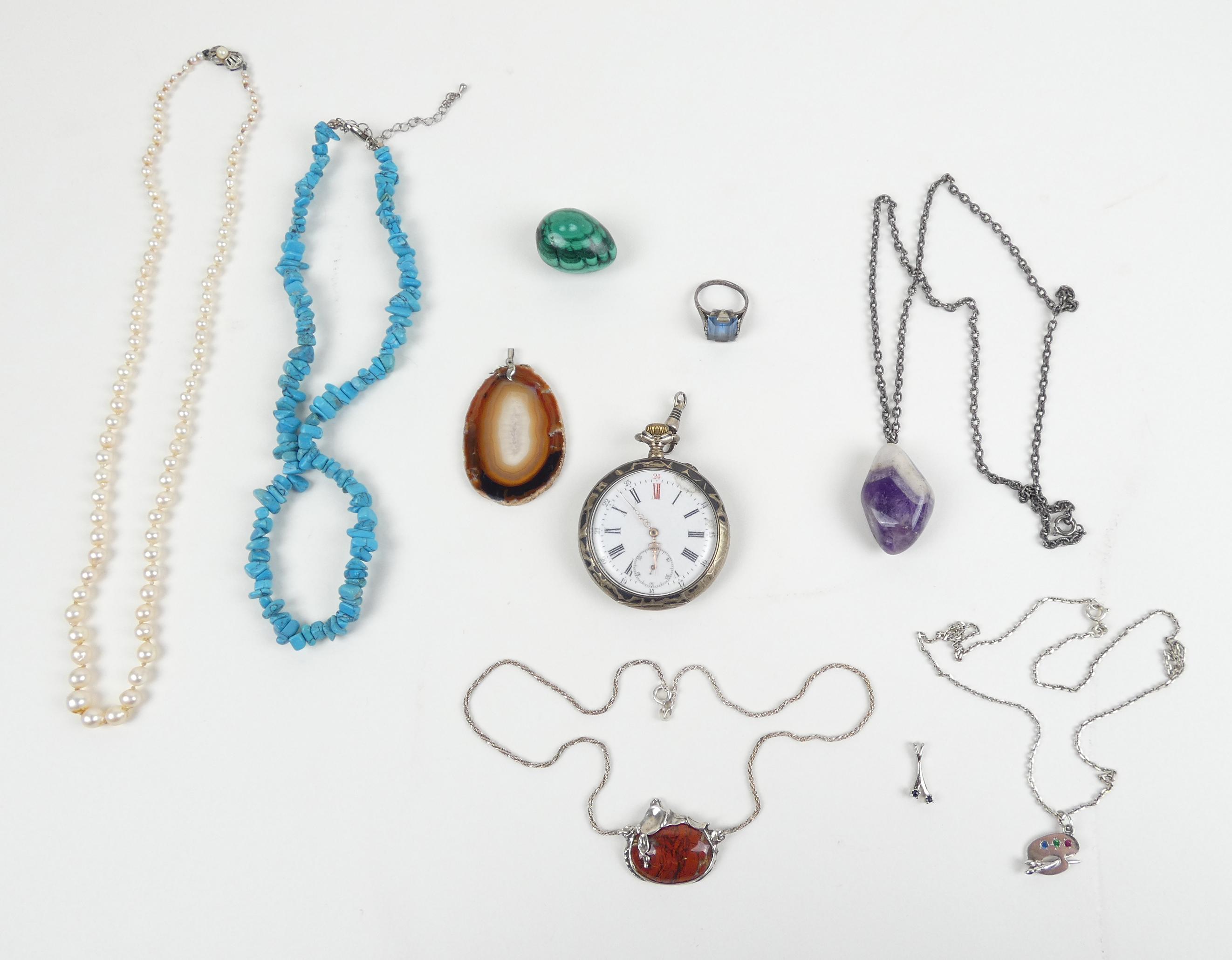 Bijoux: Lot de bijoux: Montres de gousset certaines en argent Pbrut: 86,1g + améthyste, malachite, agate (10pcs)