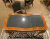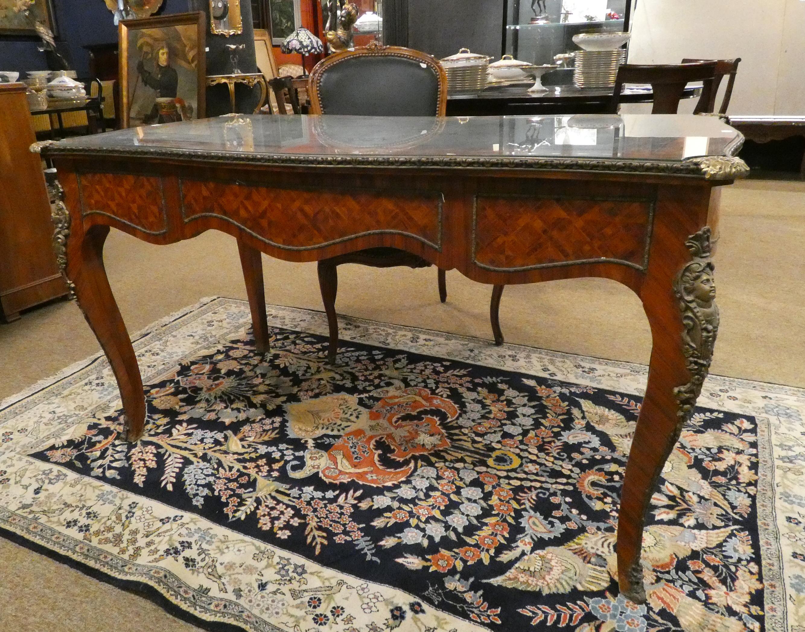 Meuble: Bureau galbé de ministre de style Louis XV en placage de bois de rose 20eS dessus cuir plateau en verre rocaille en bronze 3 tiroirs 80x142x76cm + 1 fauteuil