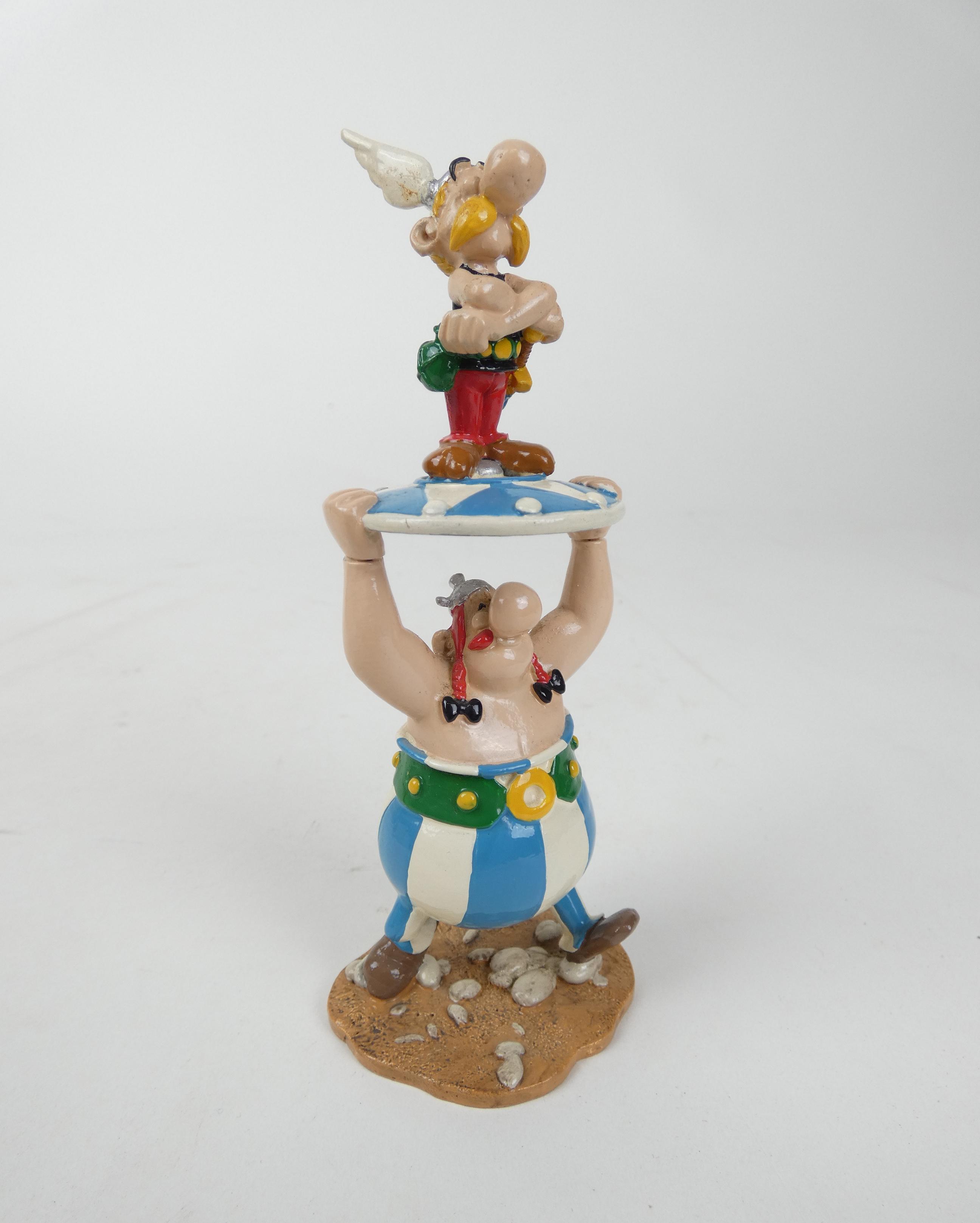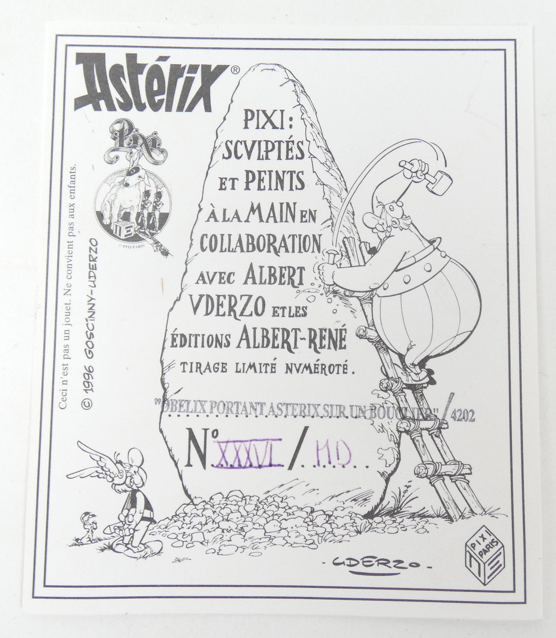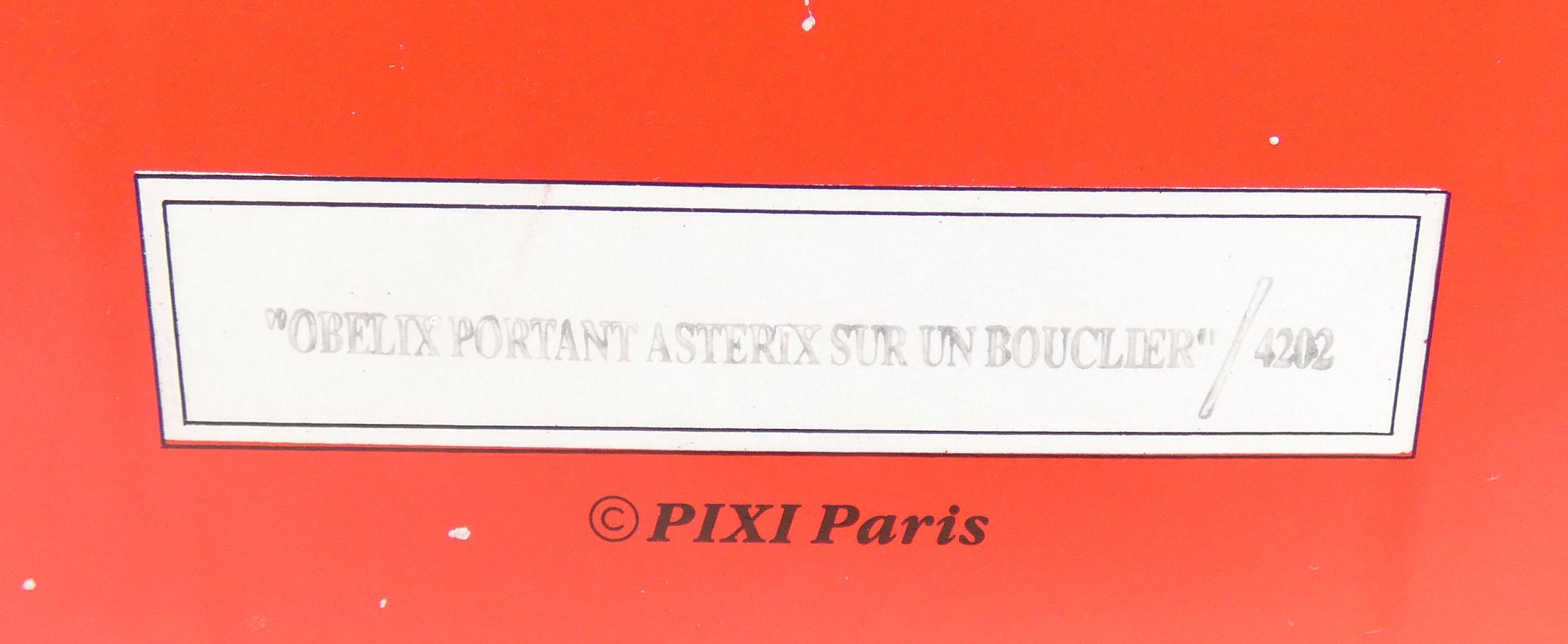 BD: Astérix, création Pixi -Obélix portant Astérix sur un bouclier- N° XXXVI/MD (900ex.) en métal sculpté circa 1997 avec certificat et boite d'origine