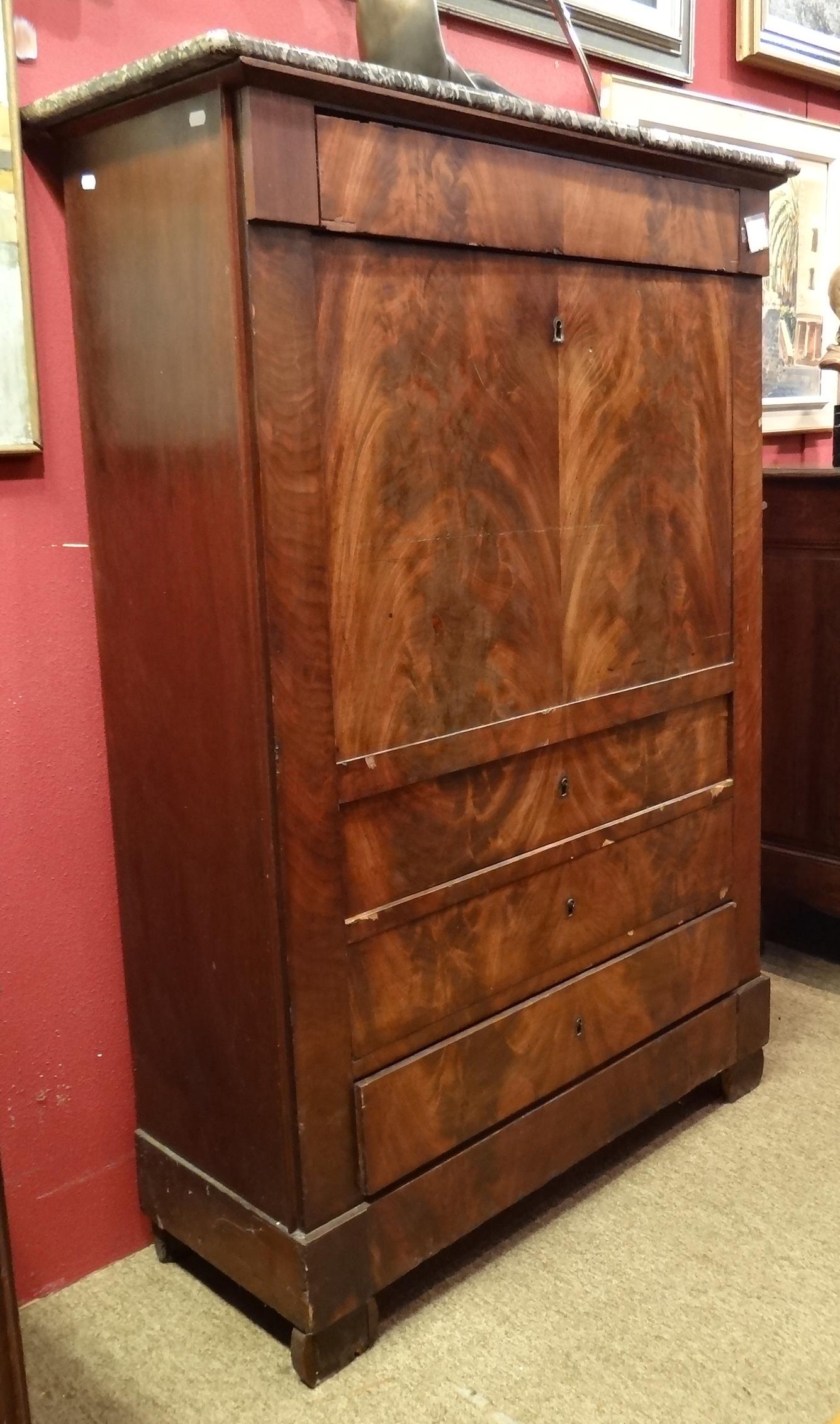 Meuble: Secrétaire droit Charles X en acajou 3T 1 abattant +1T Dessus marbre Ste Anne (acc) 87x5x39 H:138