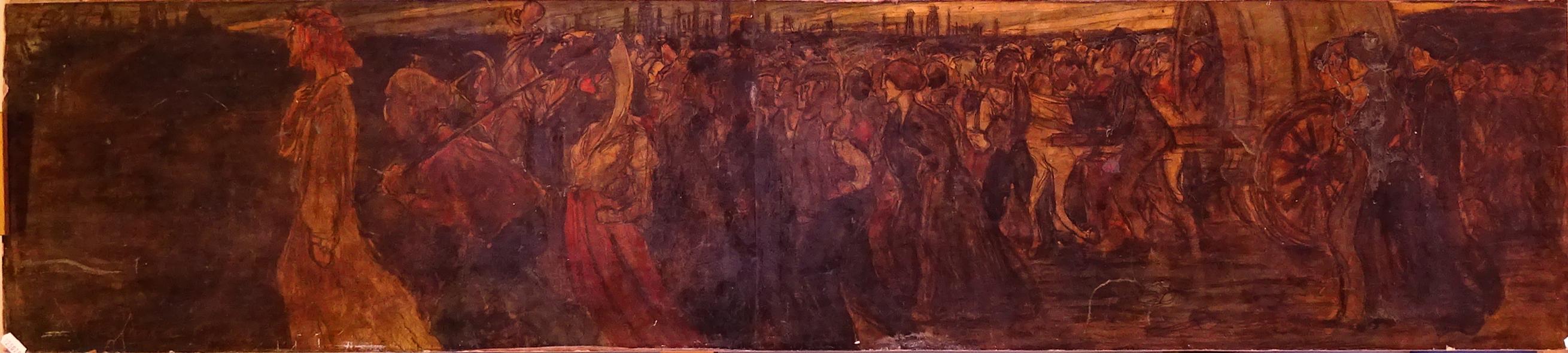 Tableau: Crayon esquisse -Il reviendra- 1898 signé *OLEFFE A.* (Auguste) (1867, 1931) a/ étiq d'expo au Salon des B.Artsde 1952 rétro Oleffe et copie du catal 35x152 ss cadre