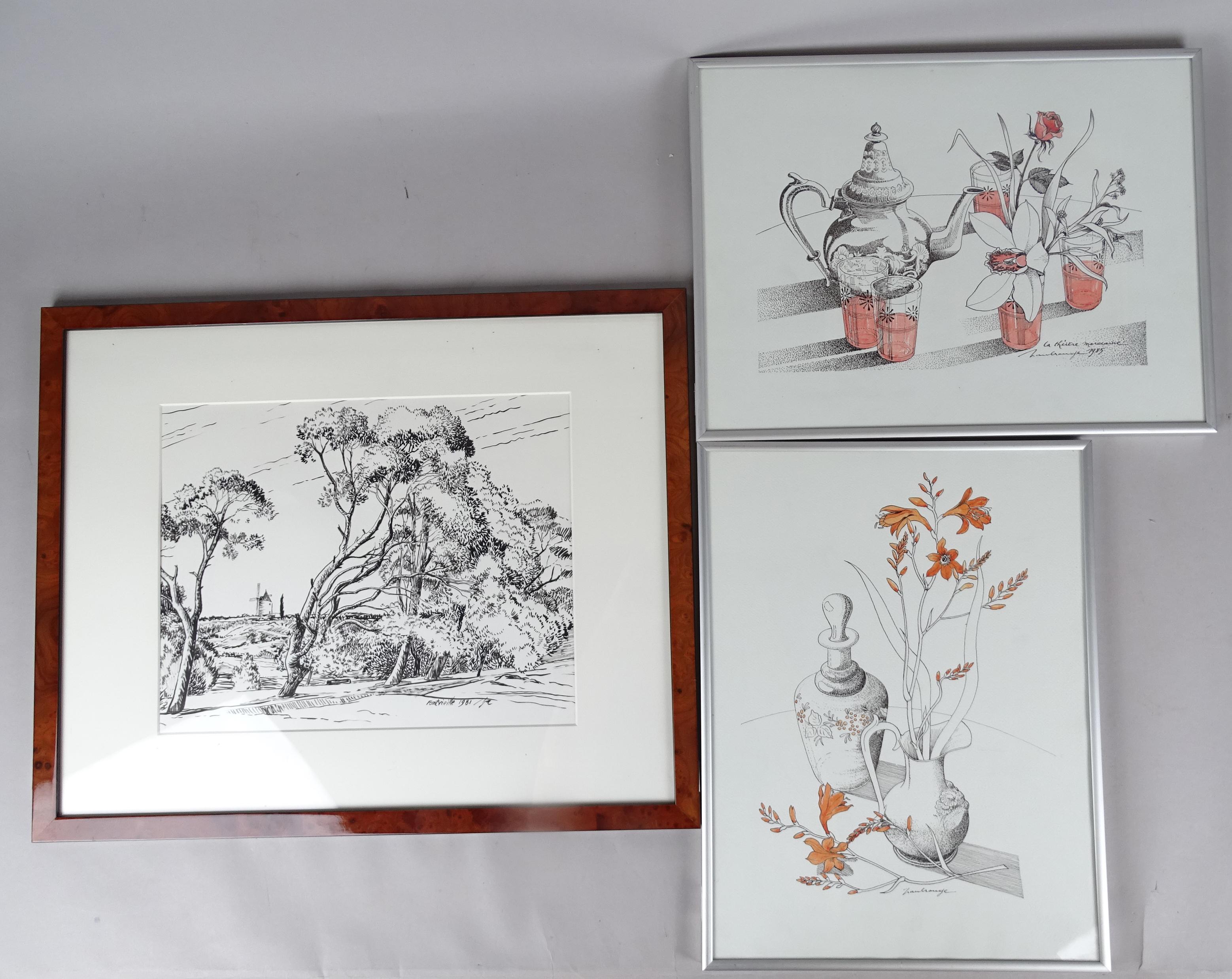 Tableau: 3 dessins à l'encre signés *ROUGE P.* (Paul) (1927) ds cadres s/v: rehaussé -Théière- 21x31, rehaussé -Cruche fleurie- 34x24 -Moulin de Daudet- 27x34cm